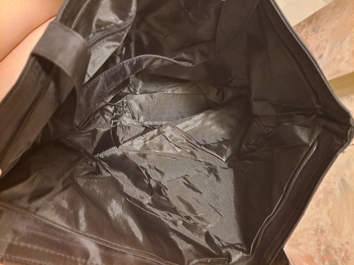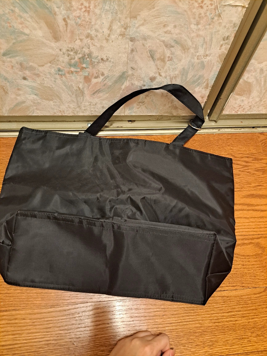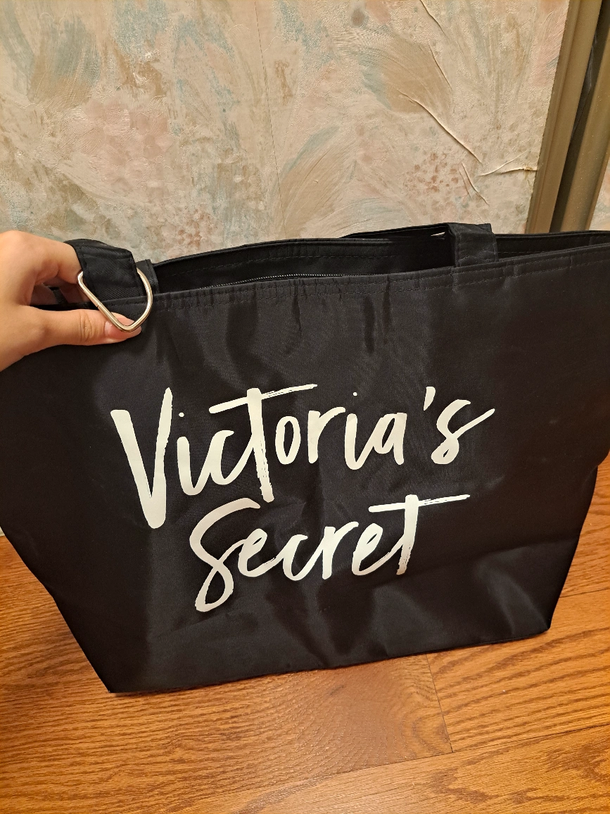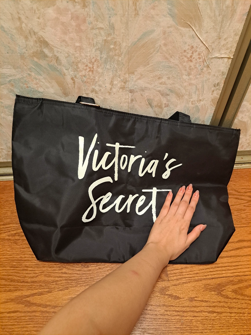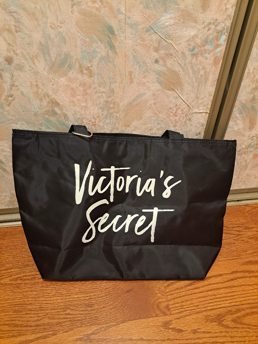 Large black tote bag. Features the Victoria's Secret logo. Great for shopping or travel. Durable material. Two handles.