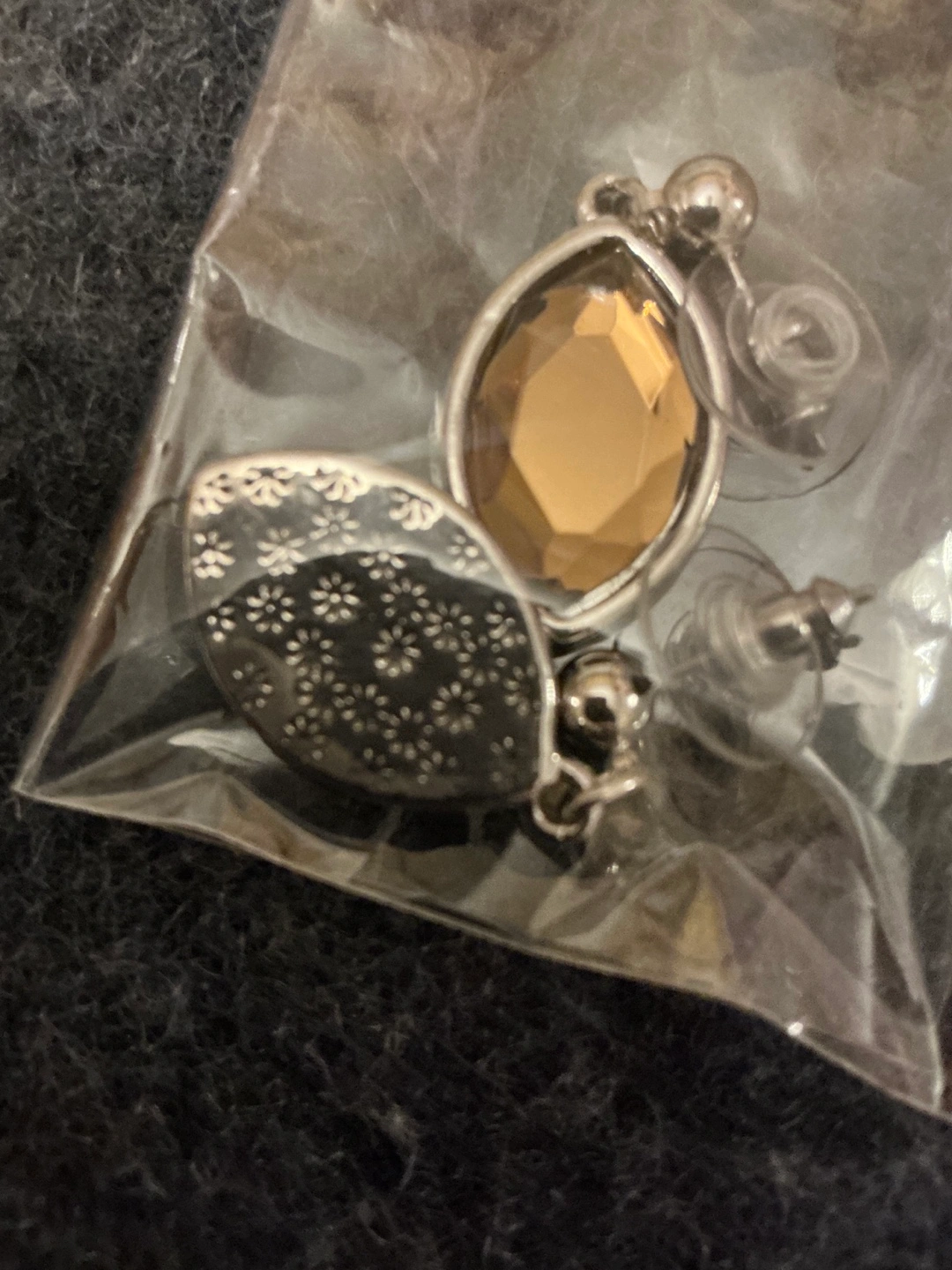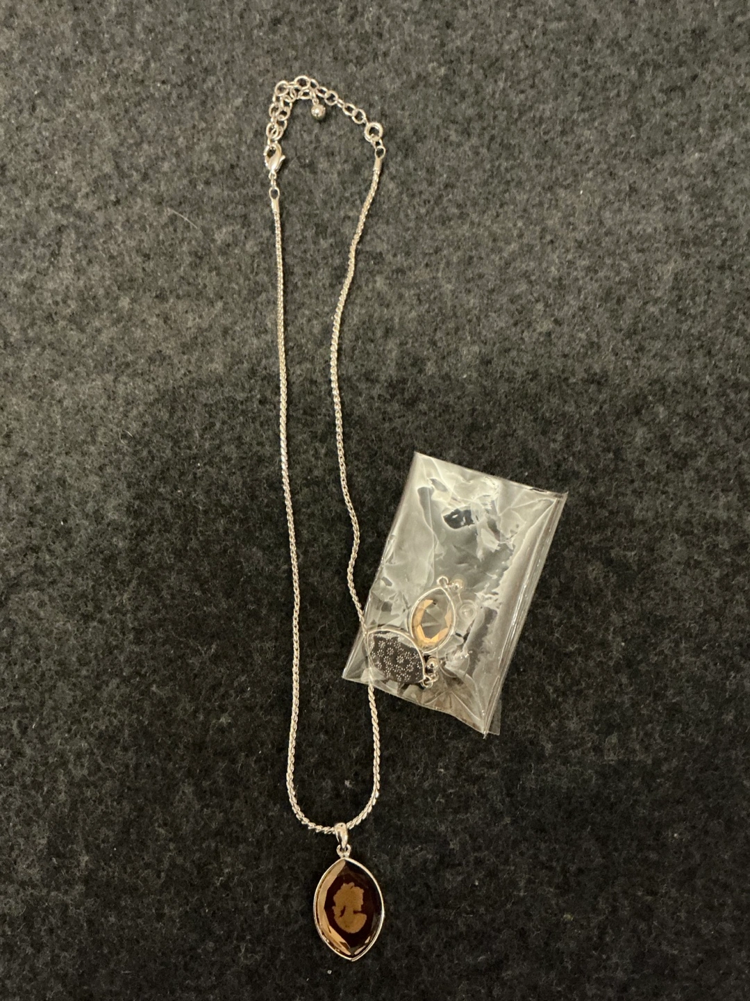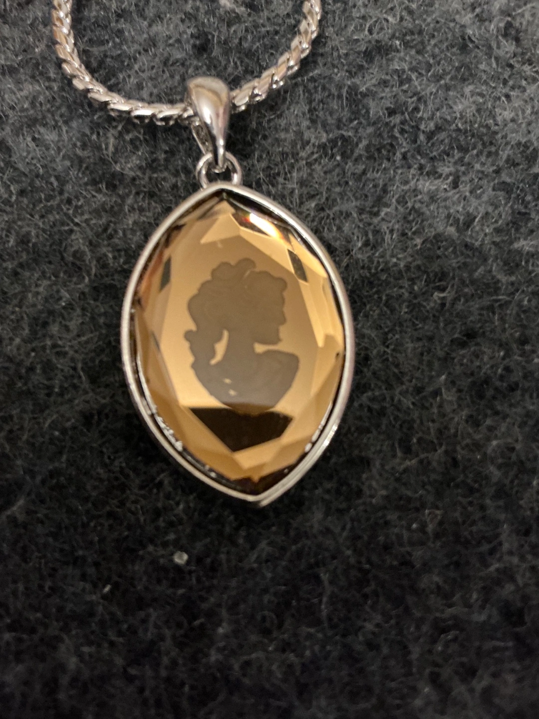 Stunning necklace and earring set. Features an amber coloured crystal pendant with a silhouette cameo and matching earrings. Silver-toned chain and metal accents. Adjustable length chain. New, never worn.