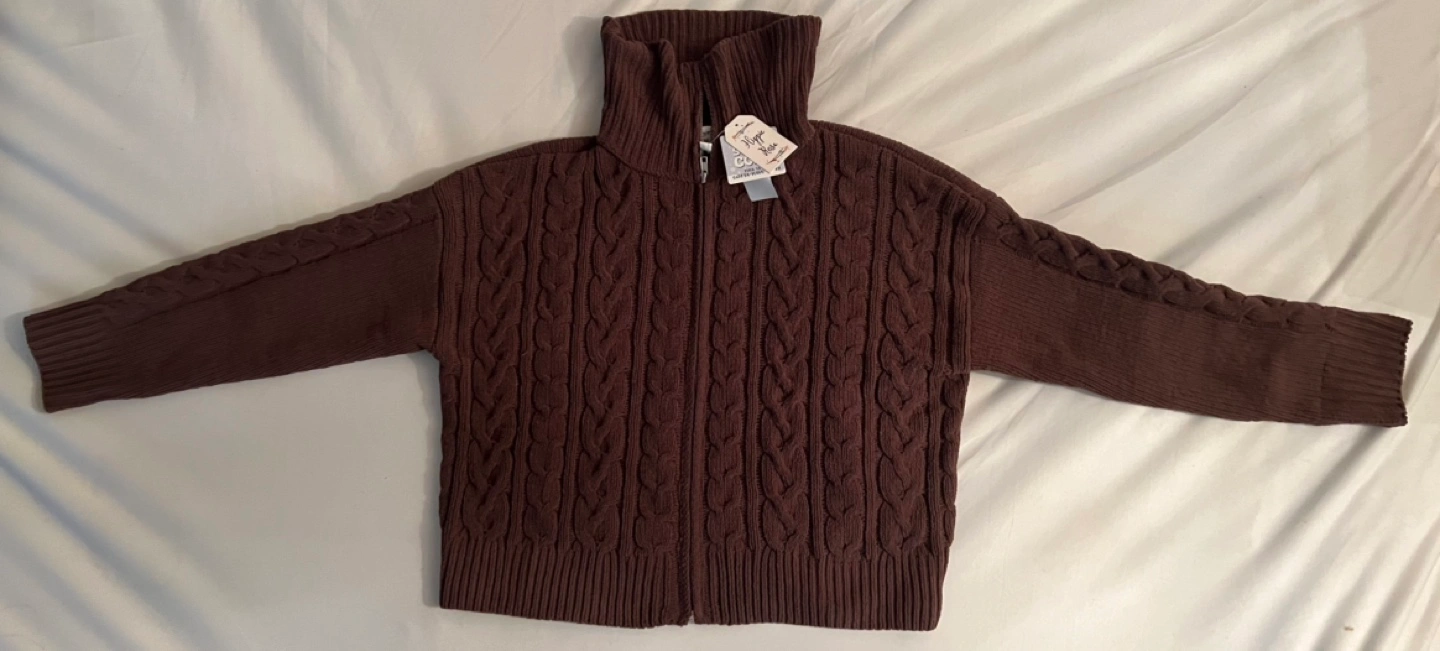 Women's brown cable knit zip-up cardigan sweater. Mock neck. Long sleeves. New with tags. Hi! I can deliver the item to any area in Downtown. Please send me a message to coordinate the time and place.