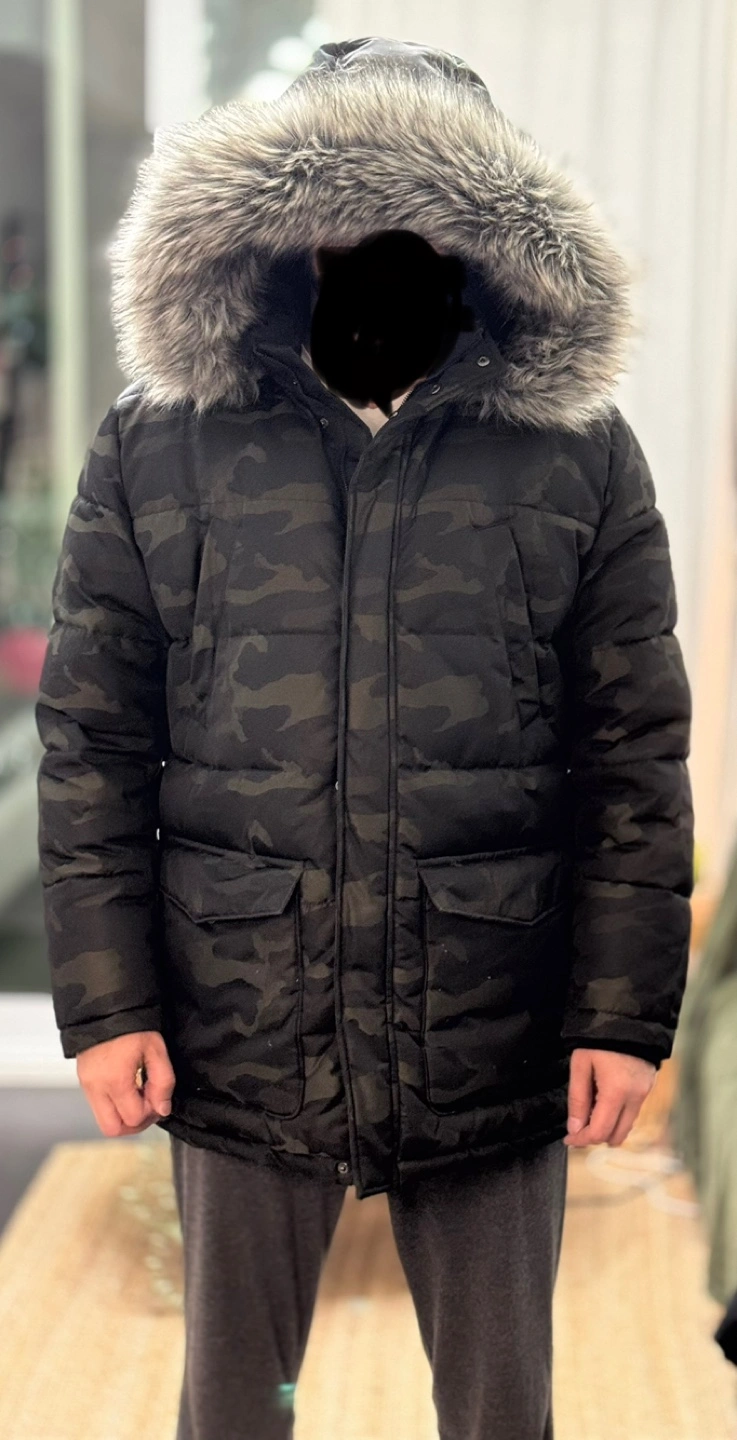 Calvin Klein Warm winter parka. Features a camouflage pattern, faux fur trim hood, and zipper closure. Multiple pockets. Great for cold weather.
