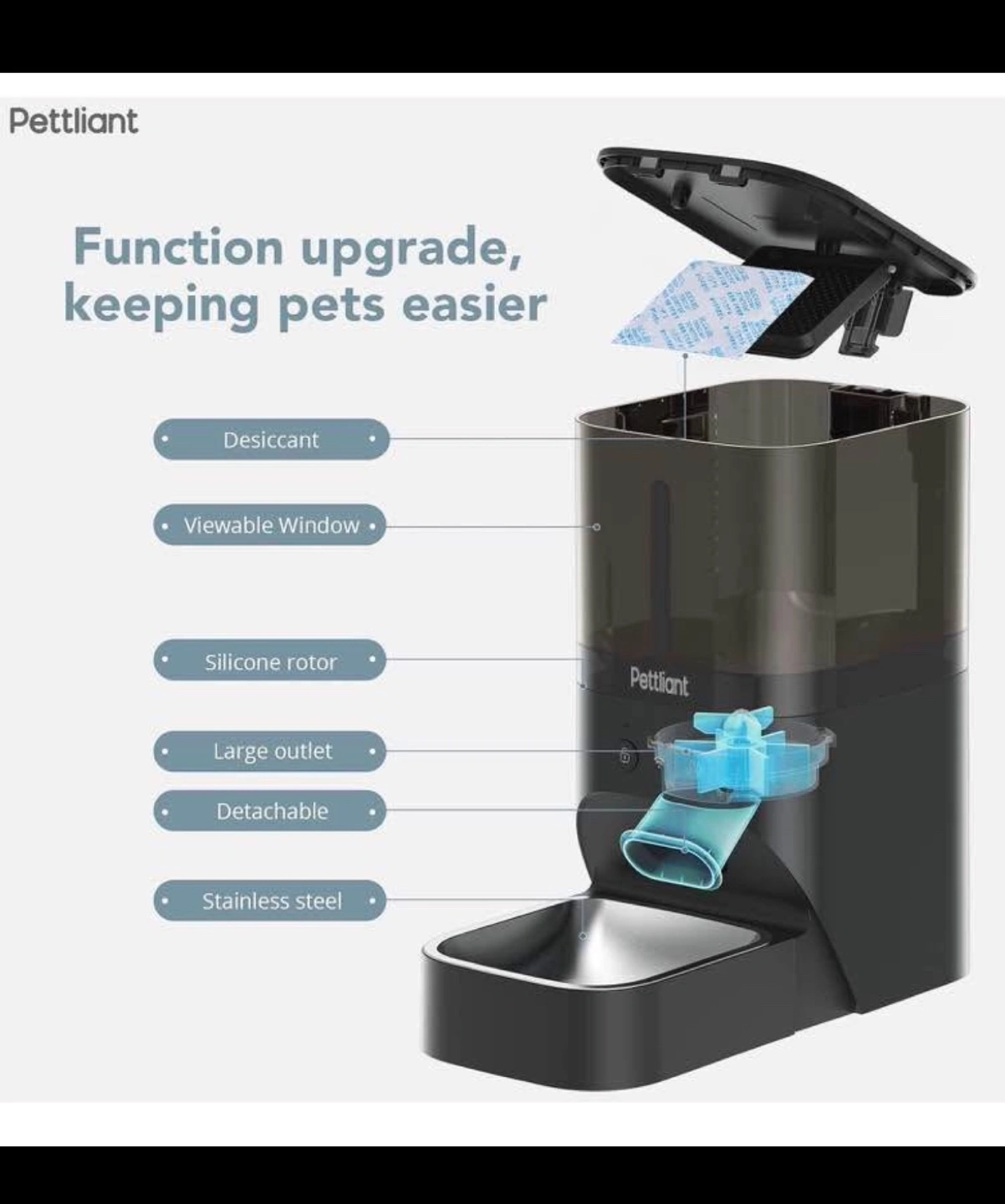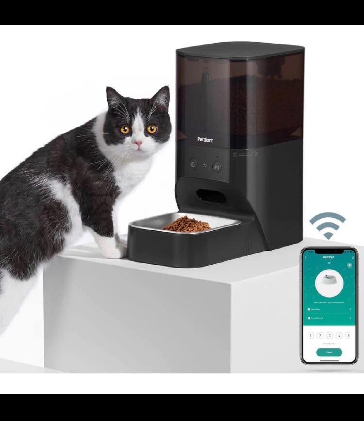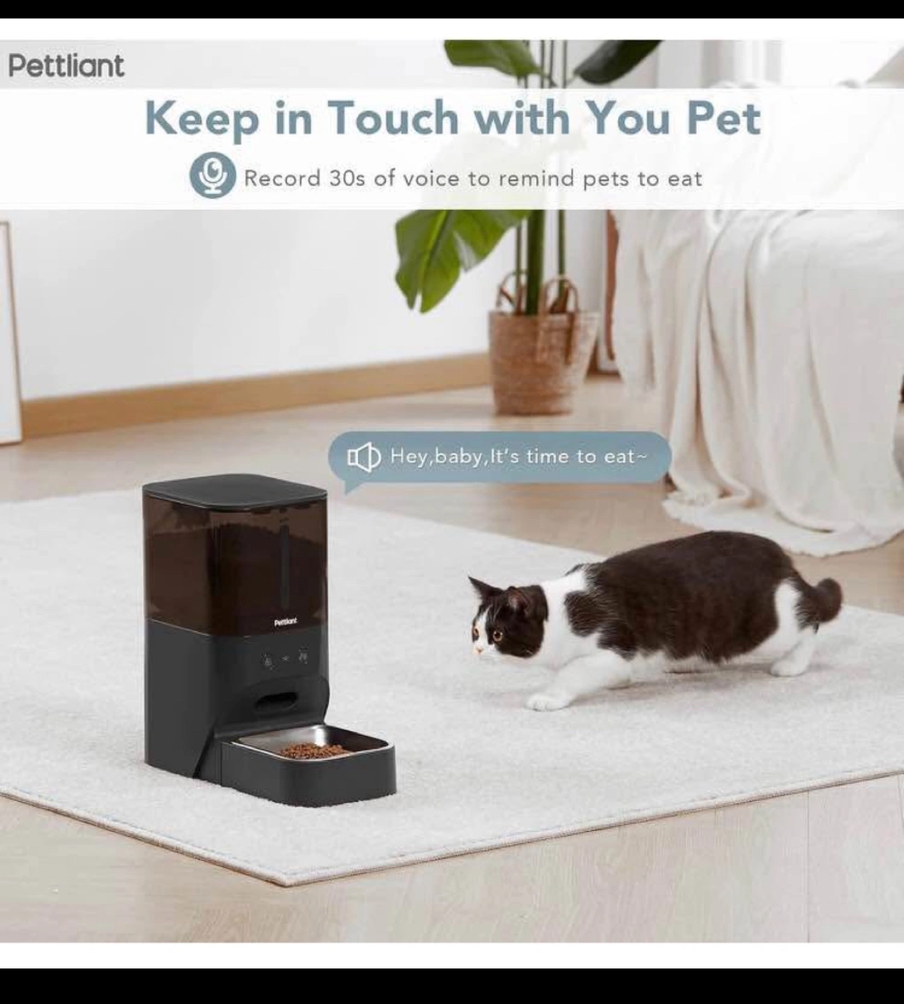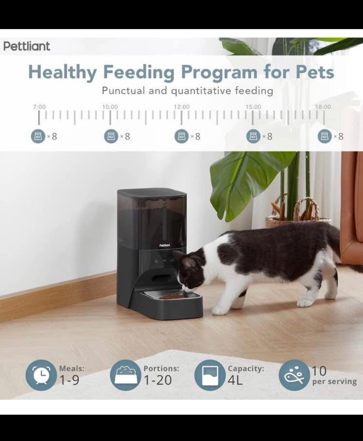 Automatic pet feeder. 4L capacity. Programmable feeding schedule. Recordable voice message. Dual power supply. Detachable for easy cleaning. Food-grade materials. Anti-theft design.