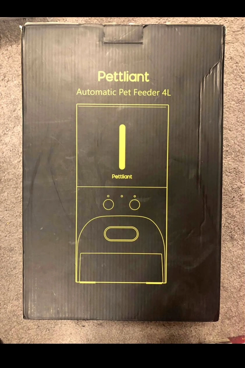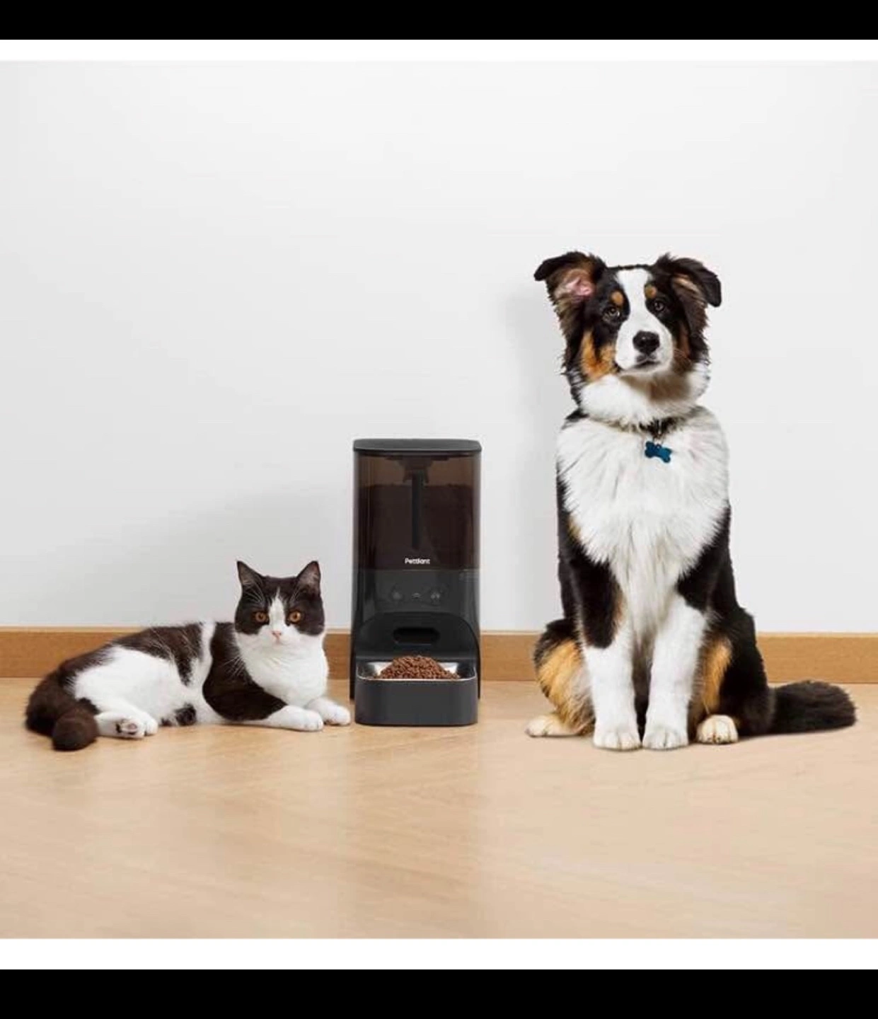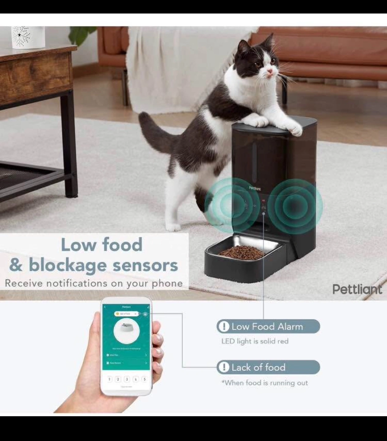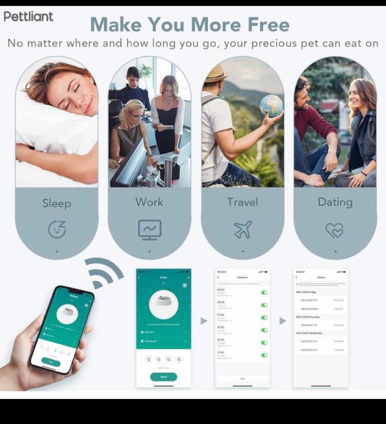 Automatic pet feeder. 4L capacity. Programmable feeding schedule. Recordable voice message. Dual power supply. Detachable for easy cleaning. Food-grade materials. Anti-theft design.