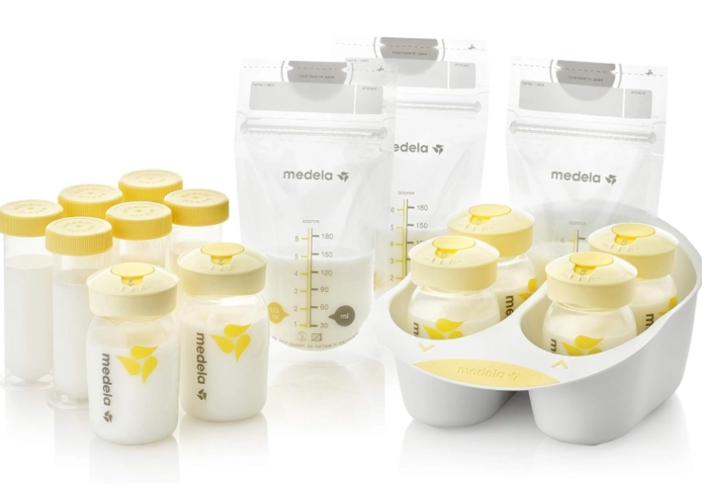 New Medela breast milk storage solution. Includes bottles, storage bags, and tray. Perfect for storing and organizing breast milk.
