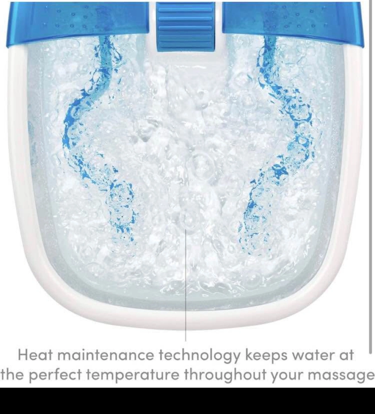 Brand new, still in box. Deluxe footbath. Features invigorating bubbles and heat maintenance. Includes massage attachments. Fits up to men's size 12.