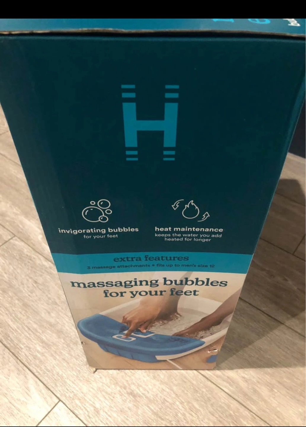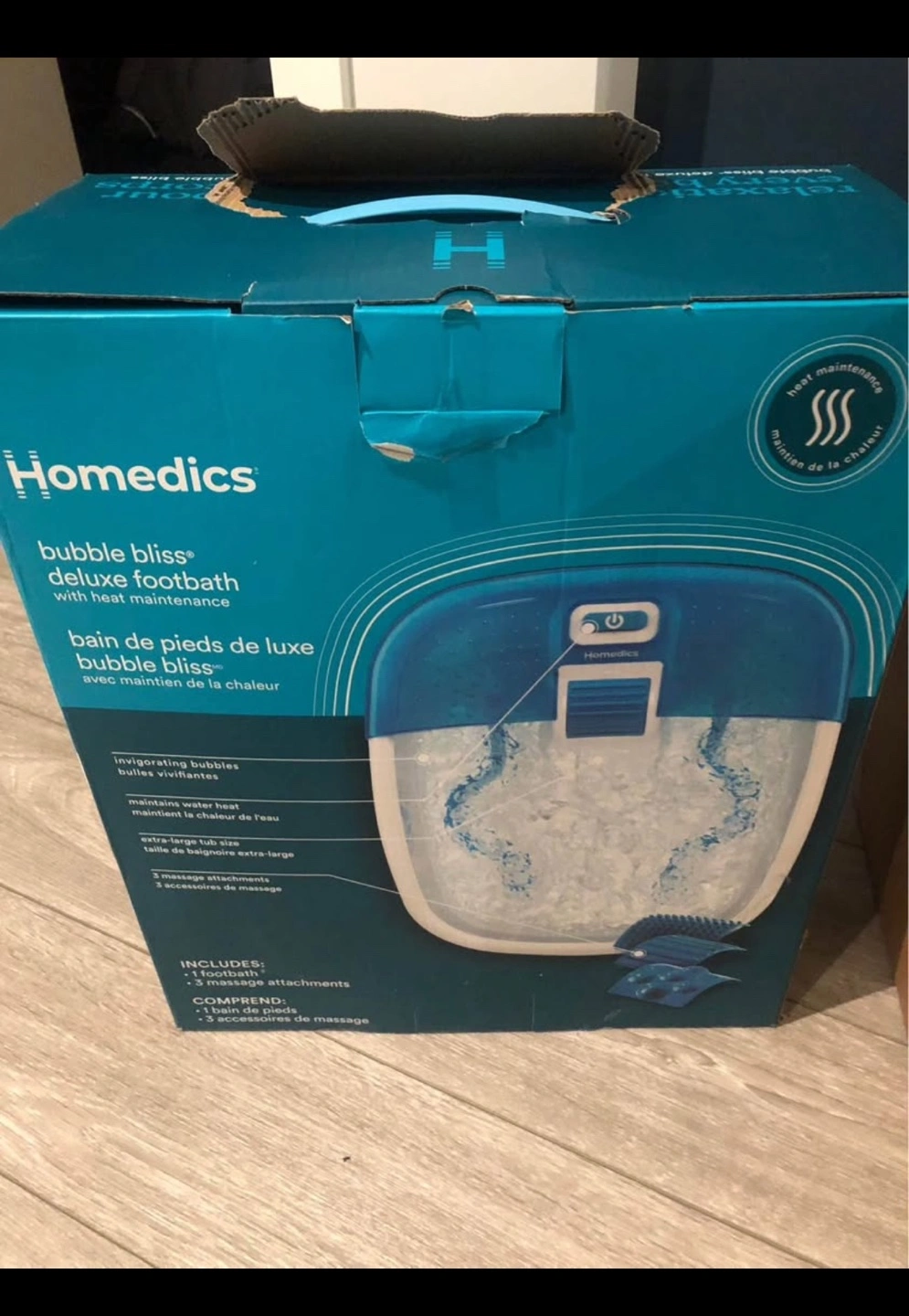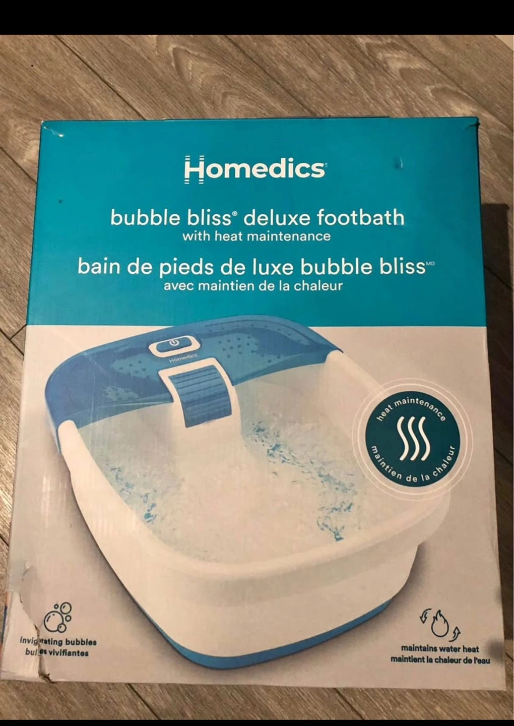 Brand new, still in box. Deluxe footbath. Features invigorating bubbles and heat maintenance. Includes massage attachments. Fits up to men's size 12.