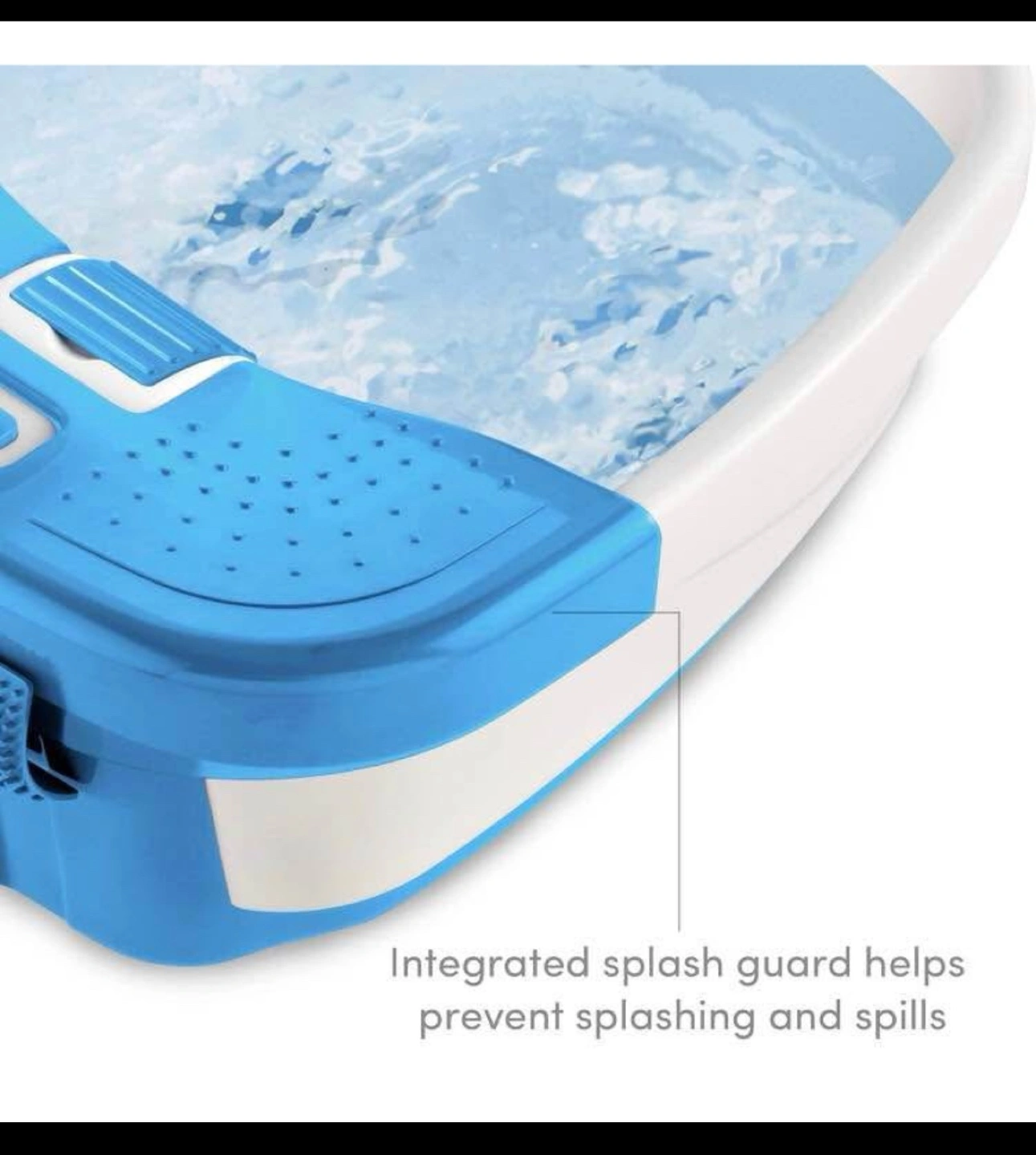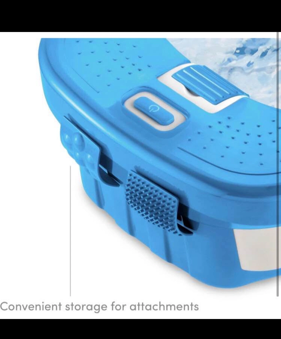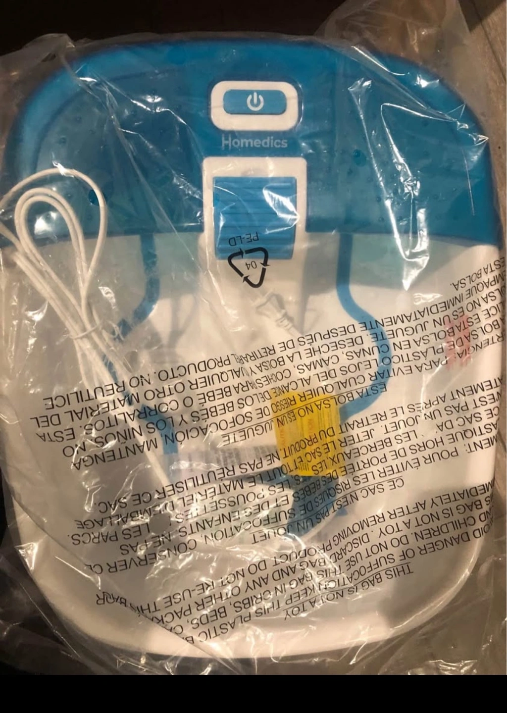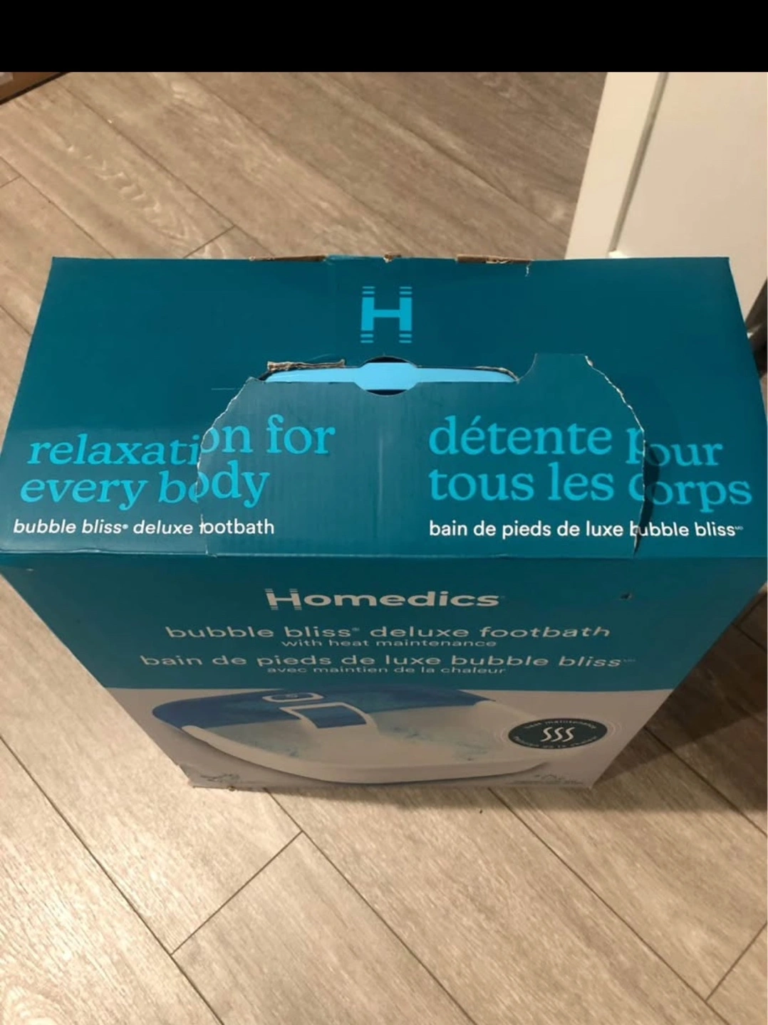 Brand new, still in box. Deluxe footbath. Features invigorating bubbles and heat maintenance. Includes massage attachments. Fits up to men's size 12.