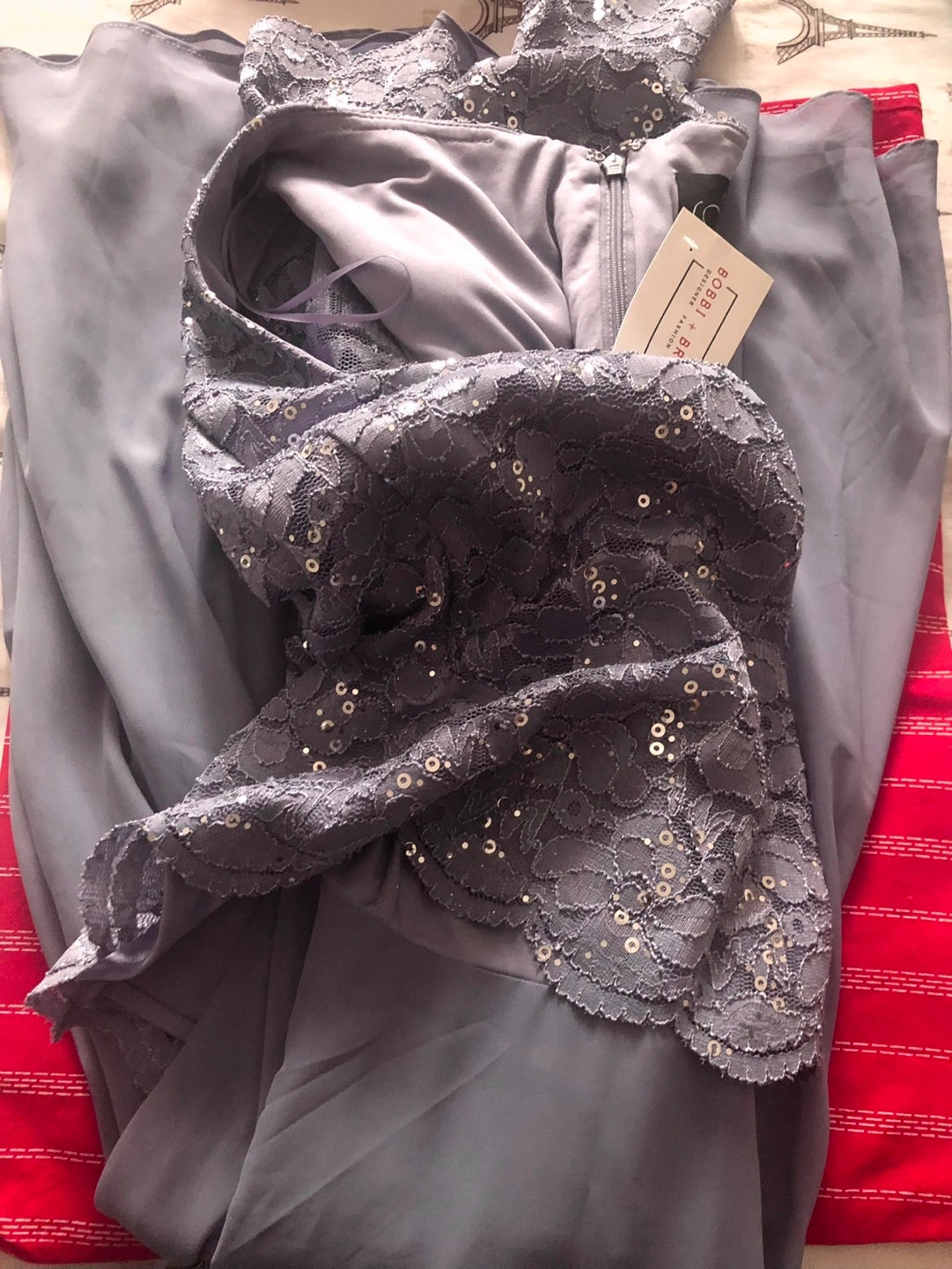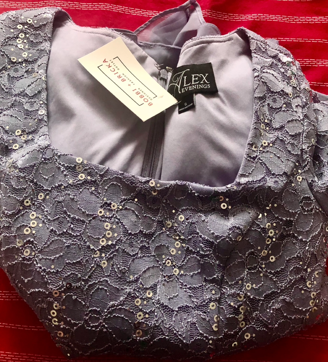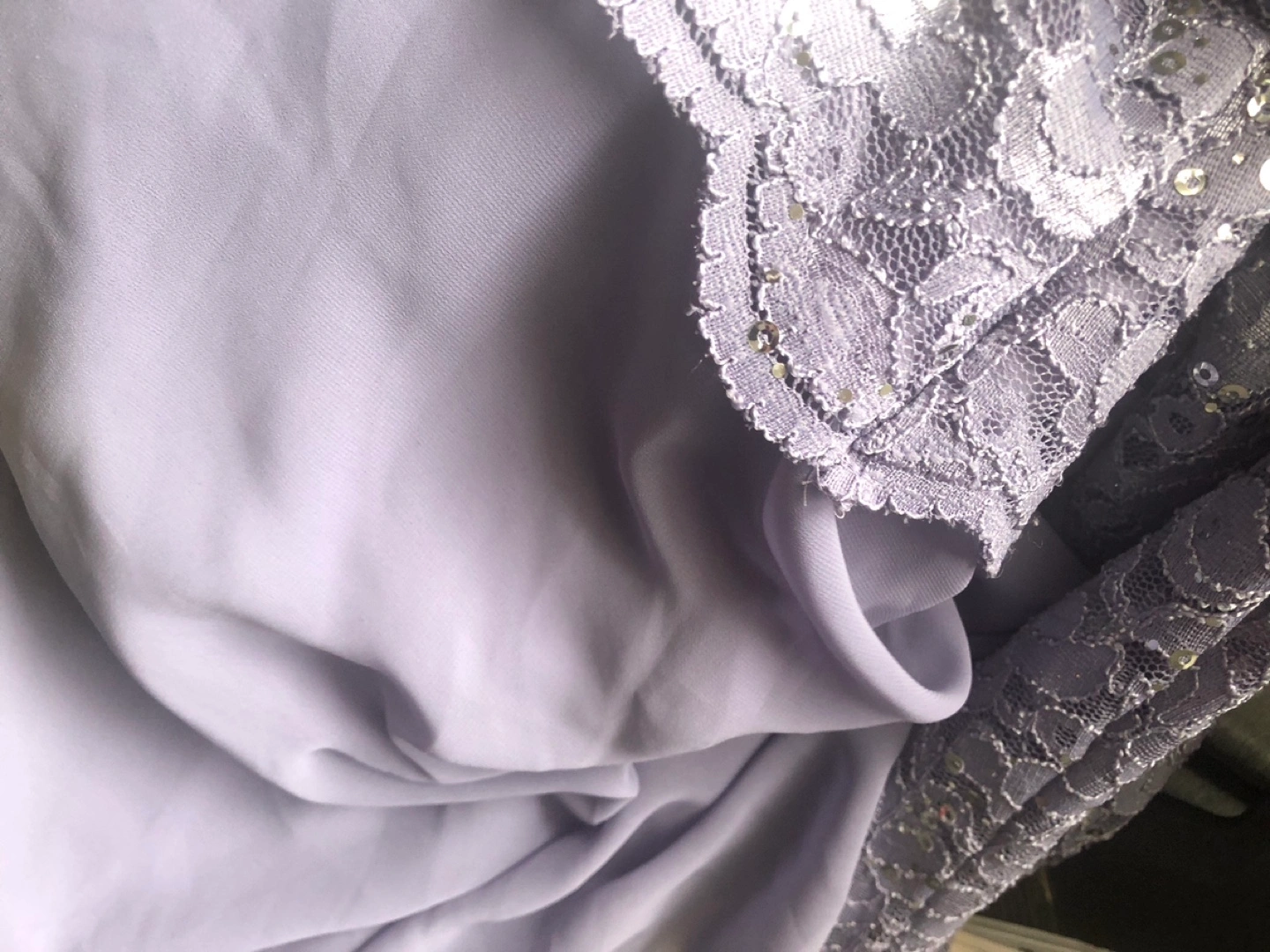 Beautiful lilac evening gown. Features delicate lace overlay with sequin accents. Size 6. Perfect for special occasions. Ankle length