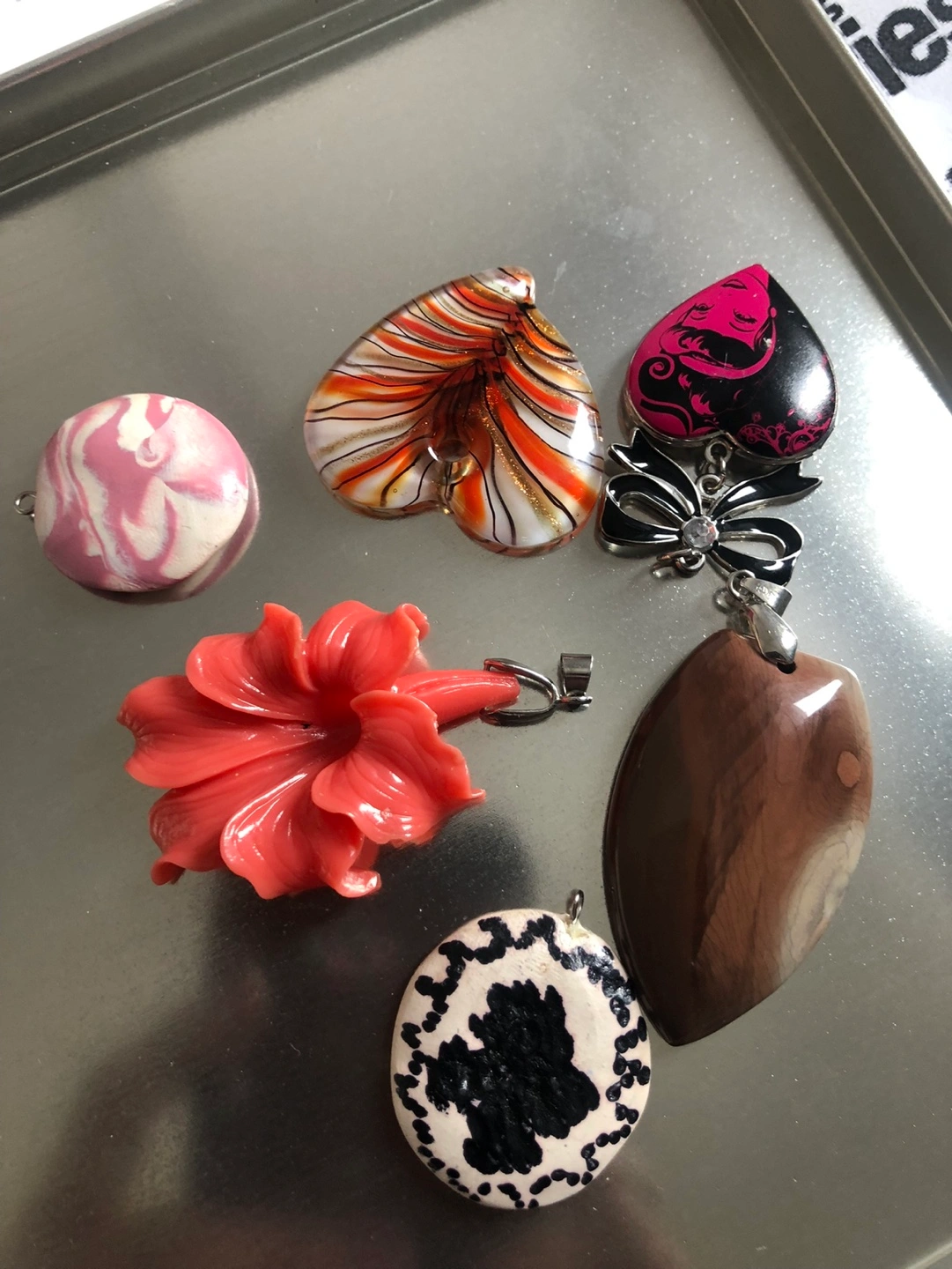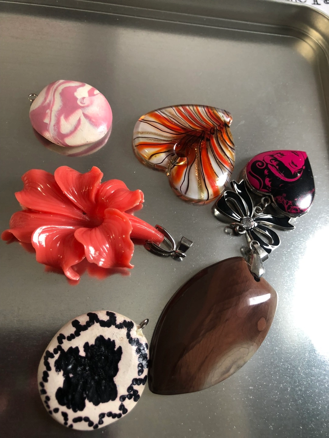 Collection of unique pendants and charms. Various colours, styles and materials. Perfect for jewellery making or crafting projects. Some appear to be resin, others stone or polymer clay. Includes heart, flower, and abstract designs.