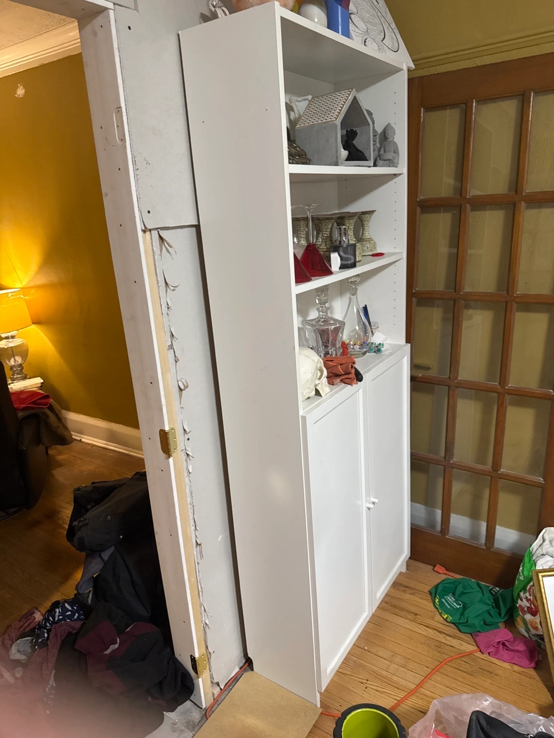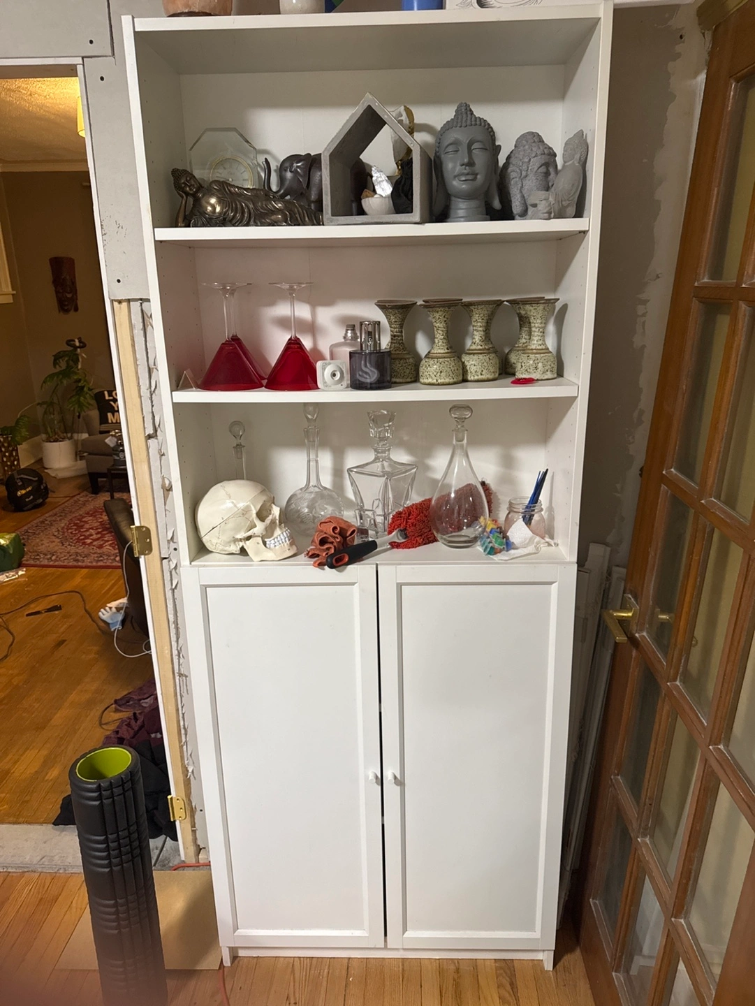175Tall white bookcase, multiple shelves, two cabinets at the bottom. Good storage solution. Some assembly required. Pick up in the young and eglinton