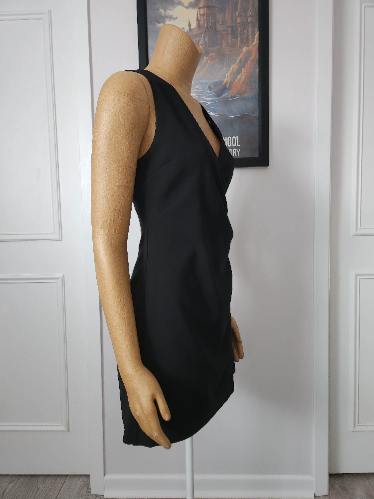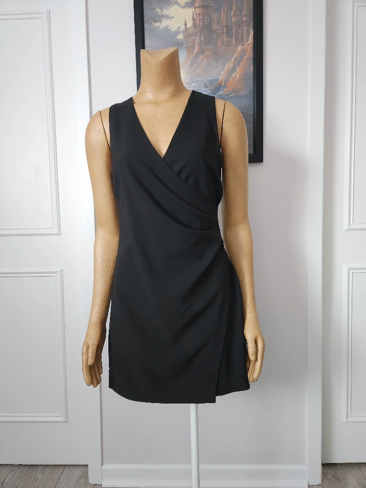 Elegant black mini dress. Sleeveless, V-neckline, and wrap style. Great for a night out.