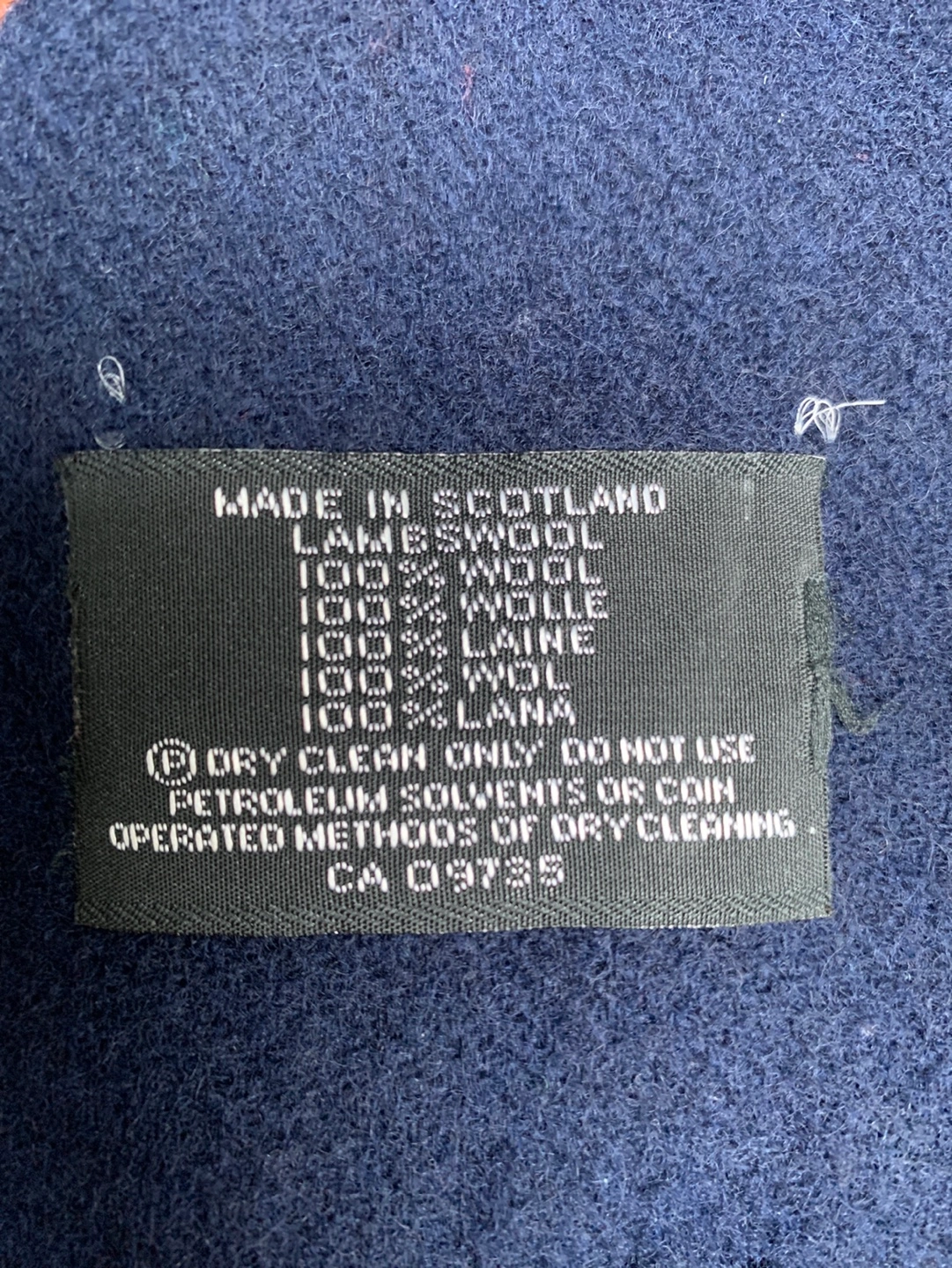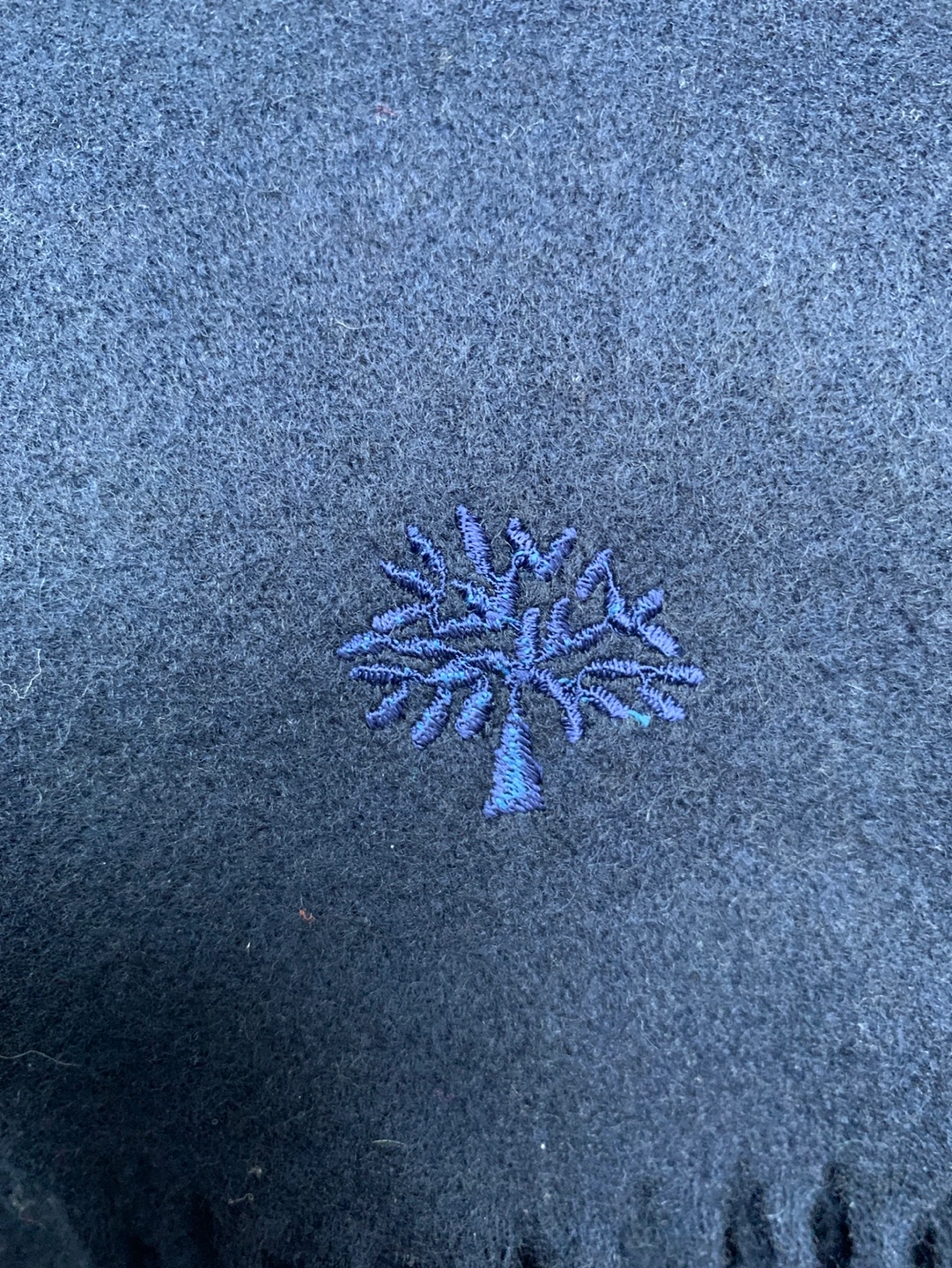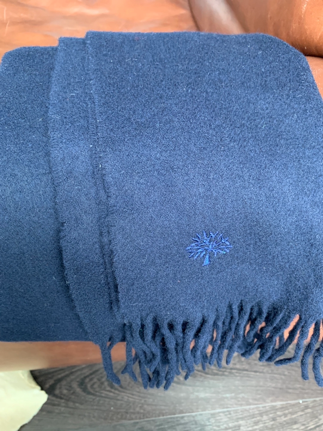 47Navy blue lambswool scarf. Made in Scotland. Features embroidered logo. Dry clean only.