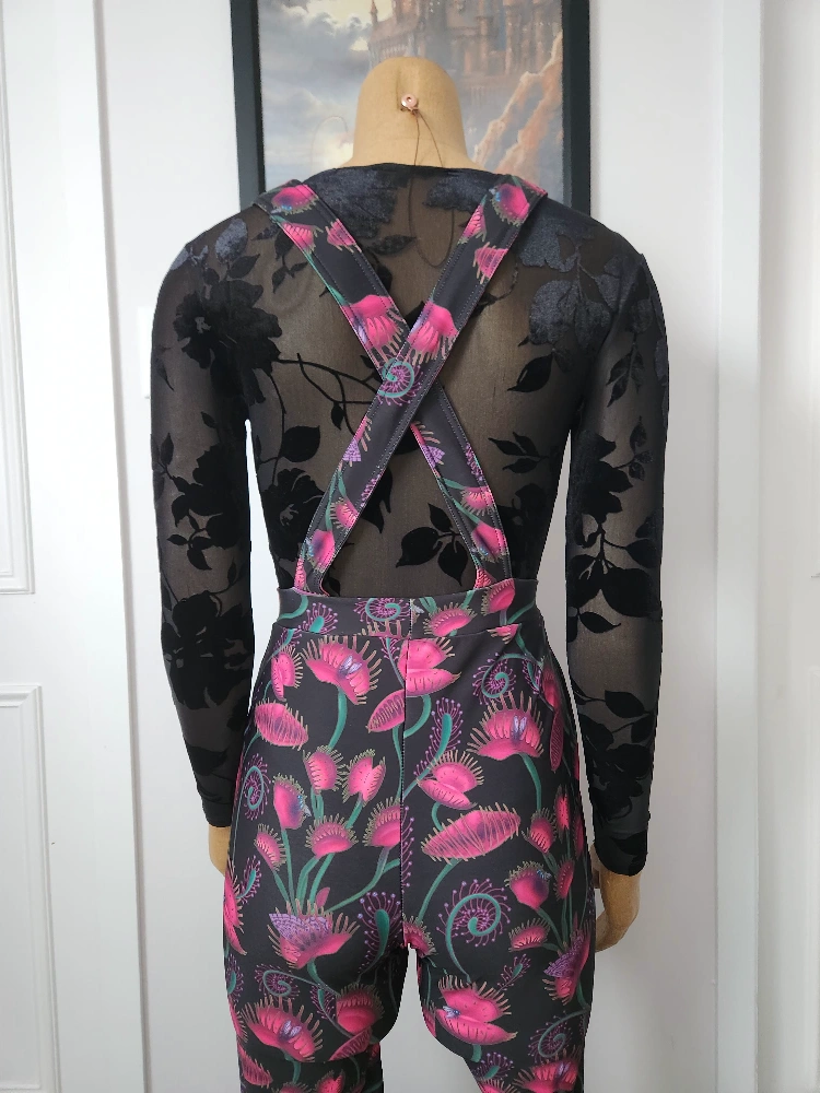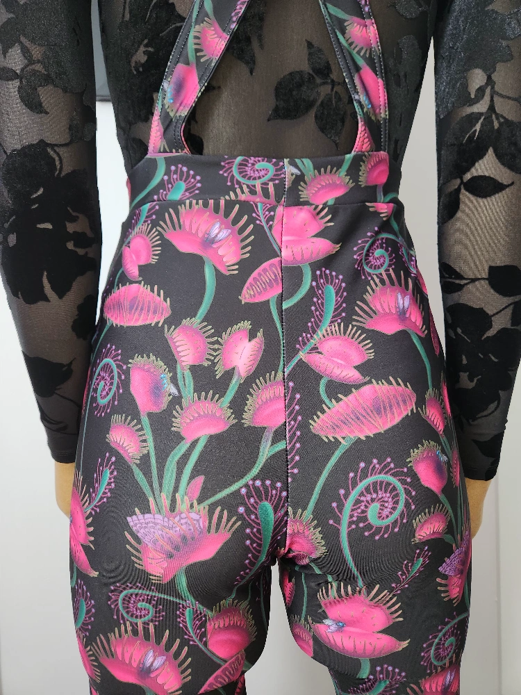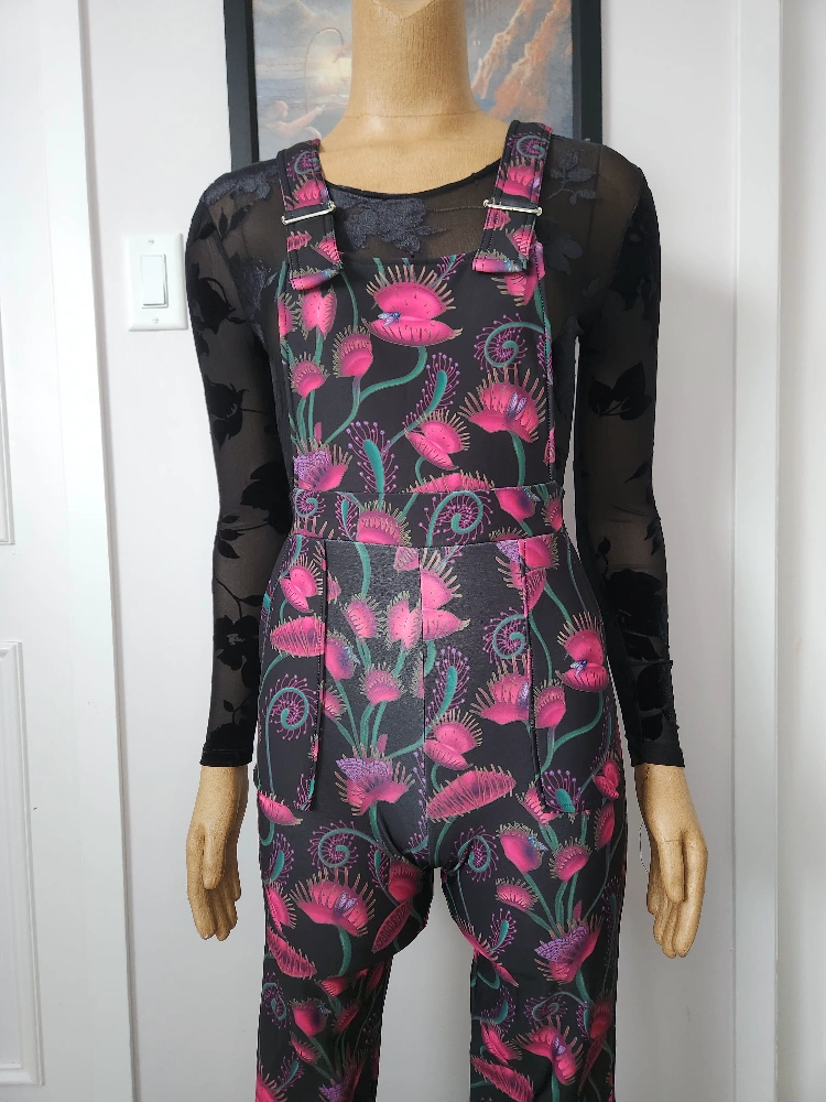 Stunning overall jumpsuit. Features a vibrant Venus flytrap print on black fabric. Cross-back straps and pockets.
