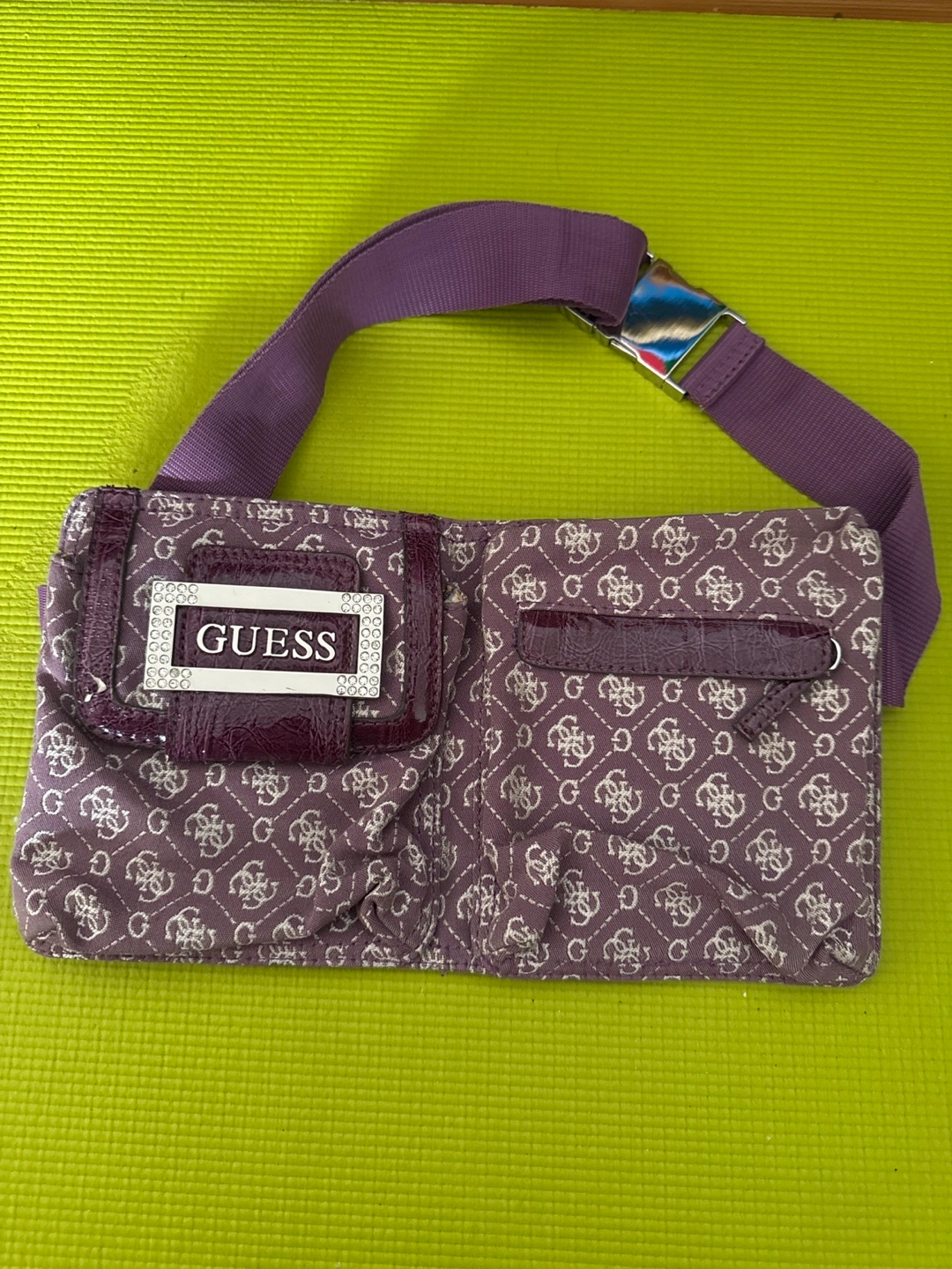 108Purple Guess fanny pack. Features a Guess logo and multiple compartments. Adjustable strap.