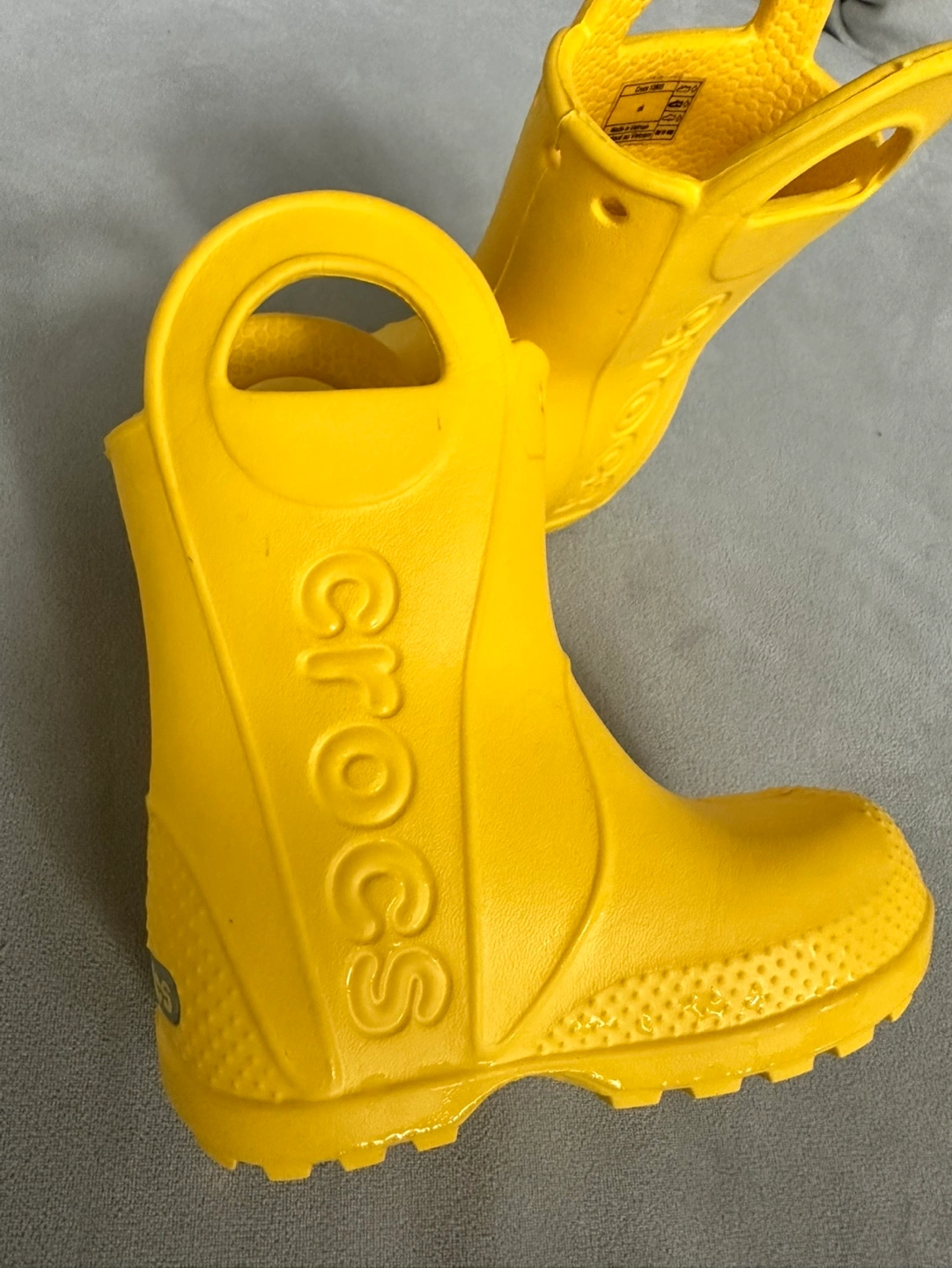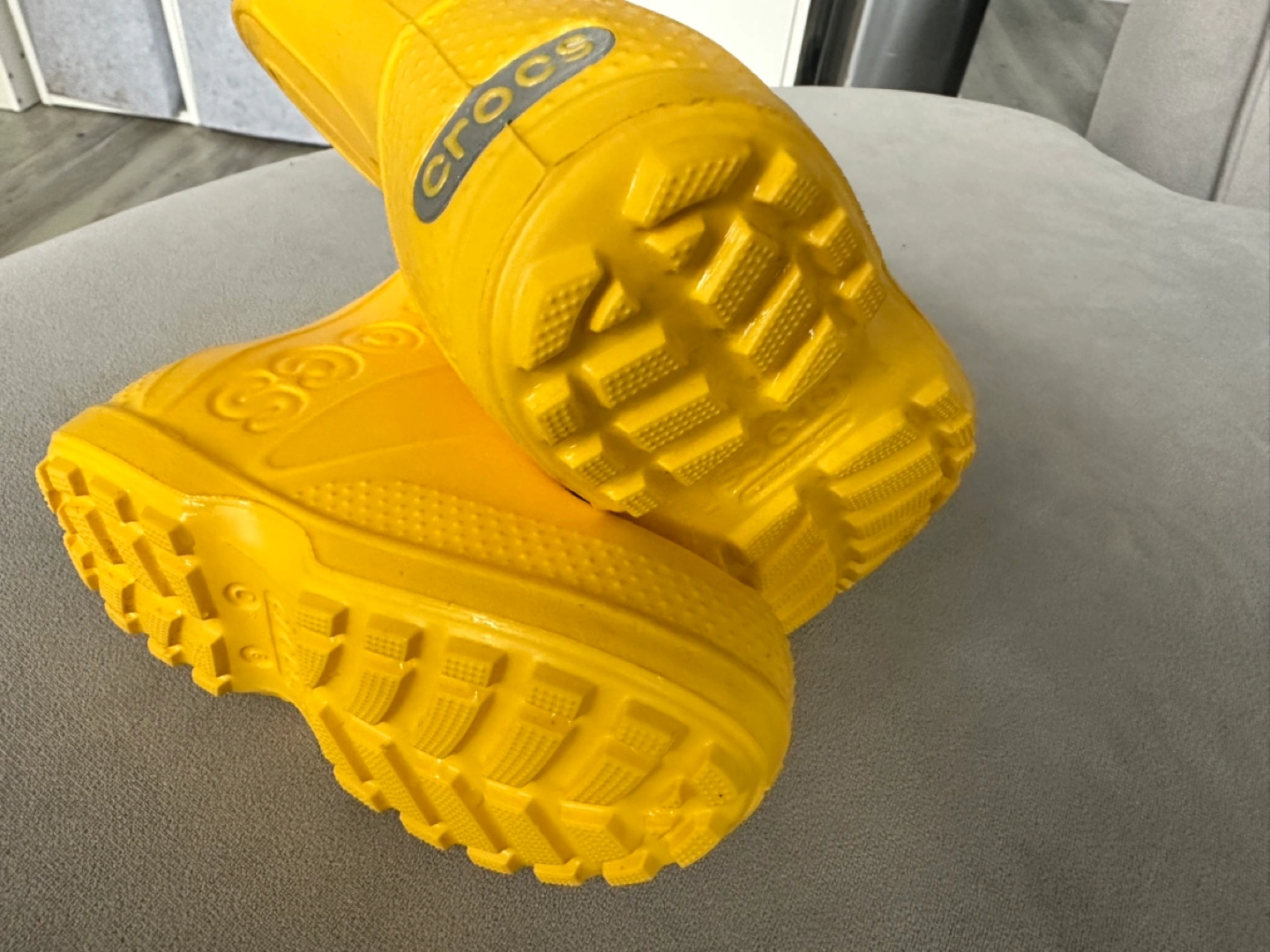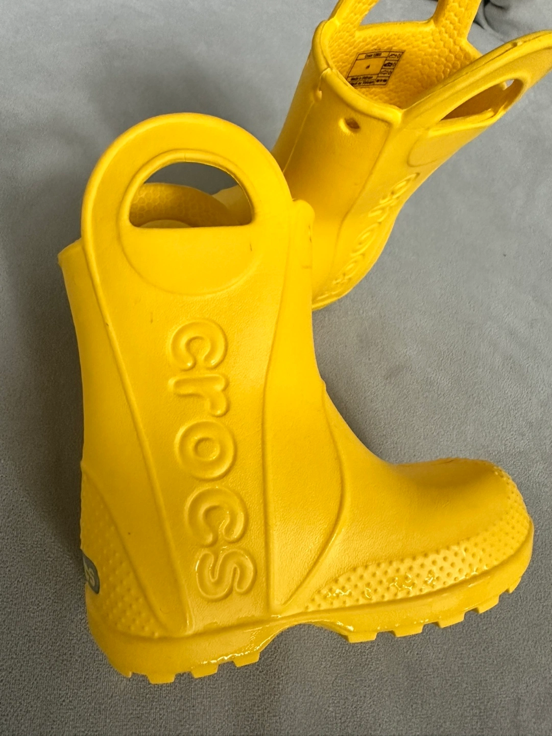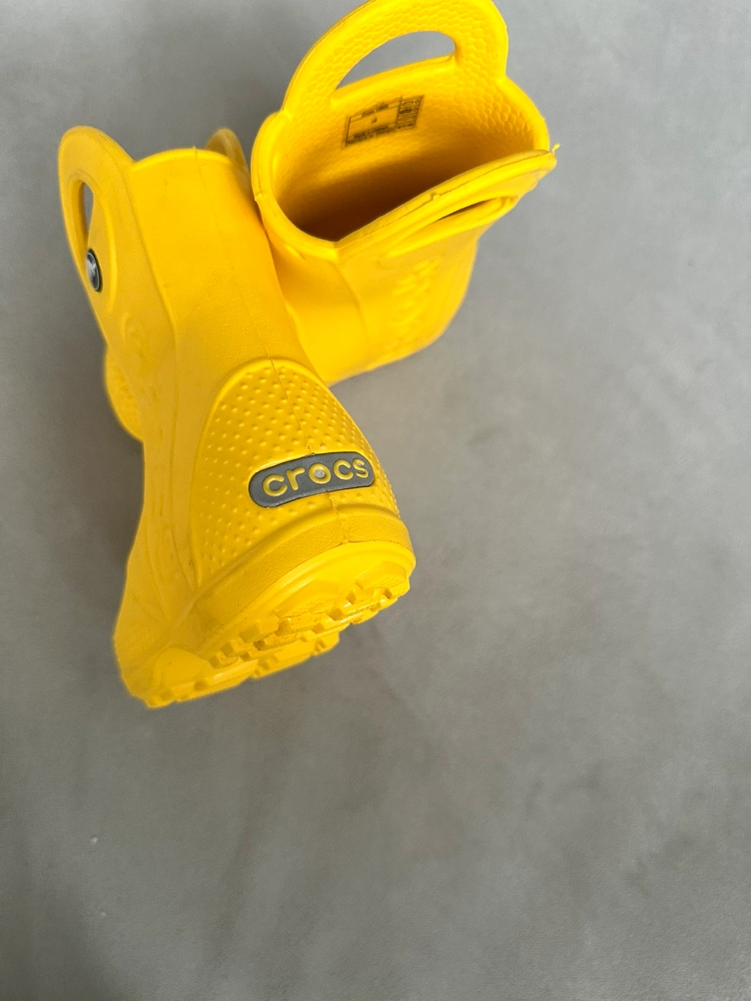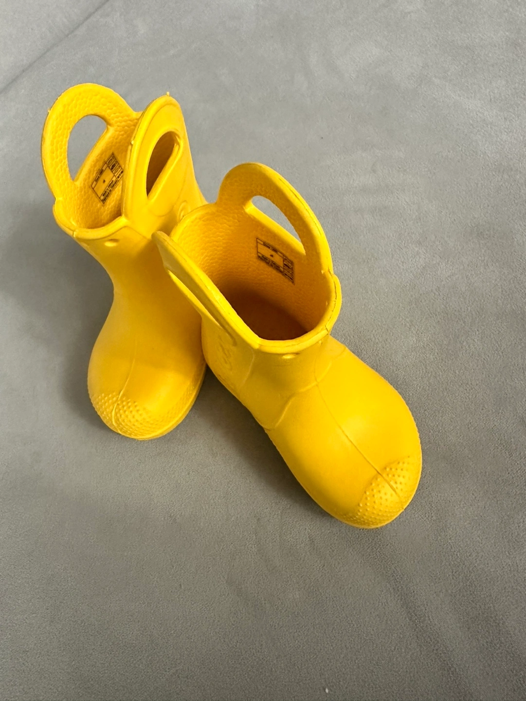 Brand new! Pair of yellow Crocs rain boots. Size C6. Features a back pull handle. Durable rubber construction. Great for puddle jumping!