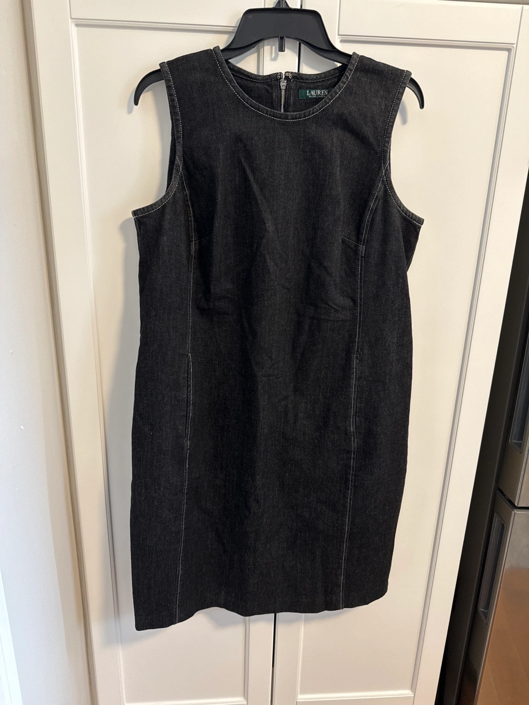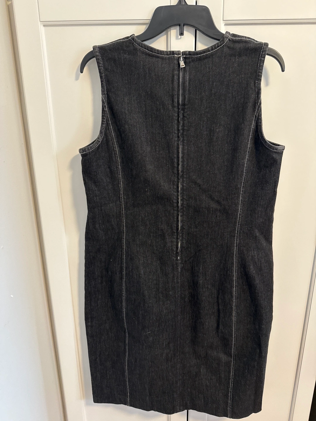 96Classic black denim dress. Sleeveless design. Fitted silhouette. Back zipper closure. Great for a casual or dressed-up look.