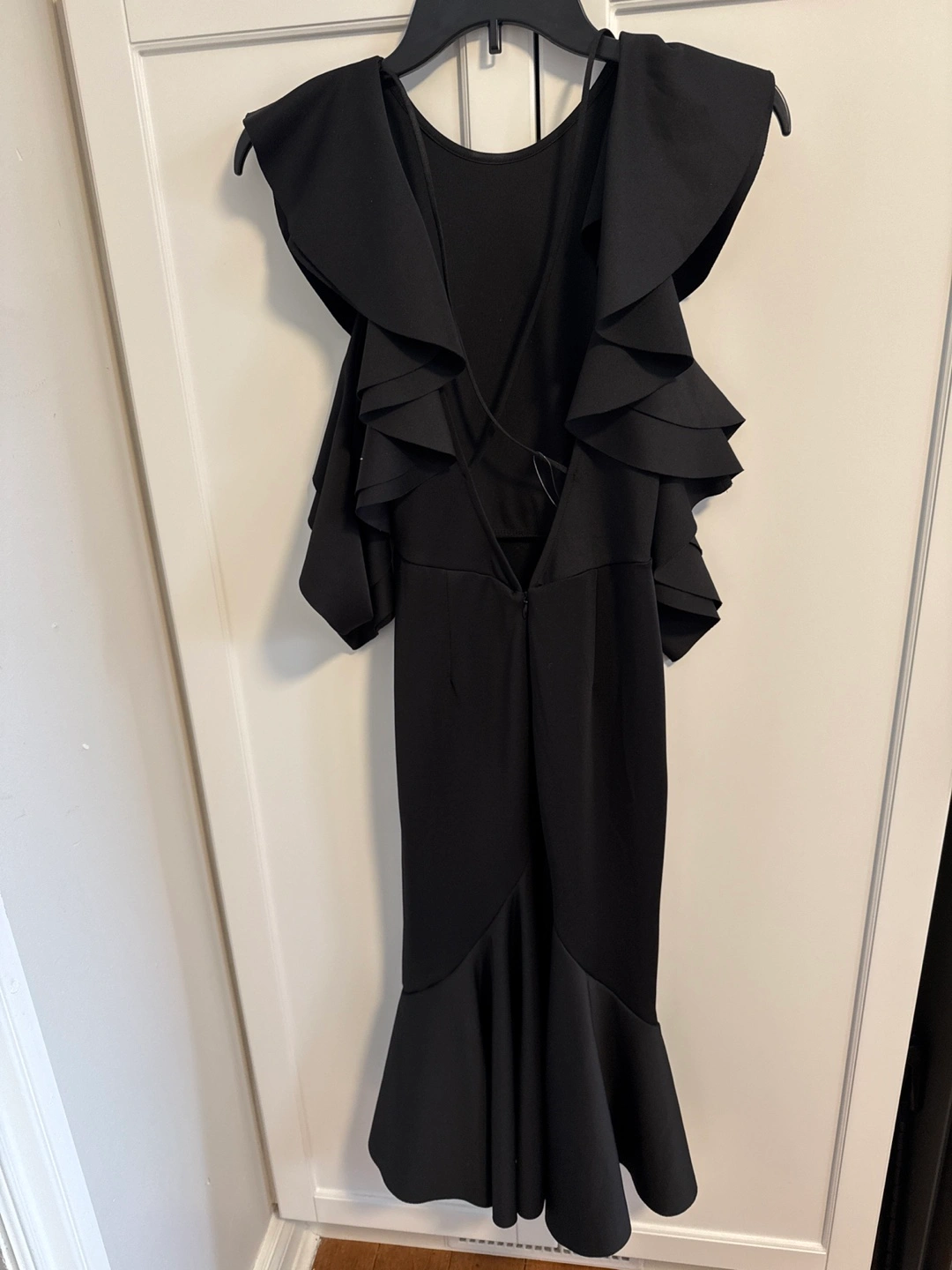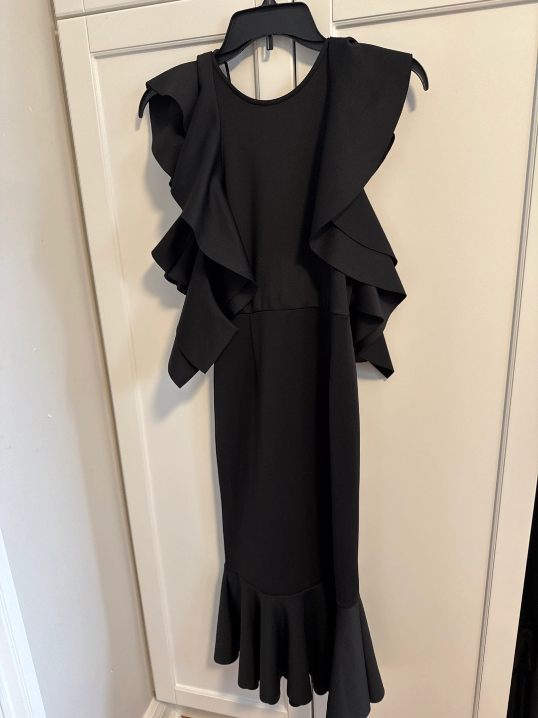 96Stunning black midi dress. Features ruffles on the shoulders and hem. Open back detail. Perfect for a special occasion.