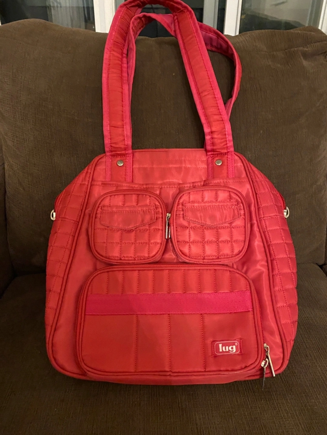 Lug Puddle Jumper Travel Carry On Overnight Bag, Quilted material In great preowned condition! In perfect shape other than minor stain inside bottom front pocket (see picture) In bright hot pink colour, perfect for the spring and summer ๐ธ Removable mirror in bottom front pocket Shoe compartment