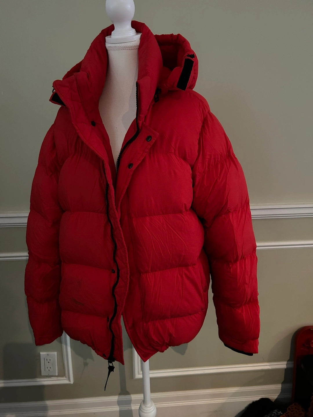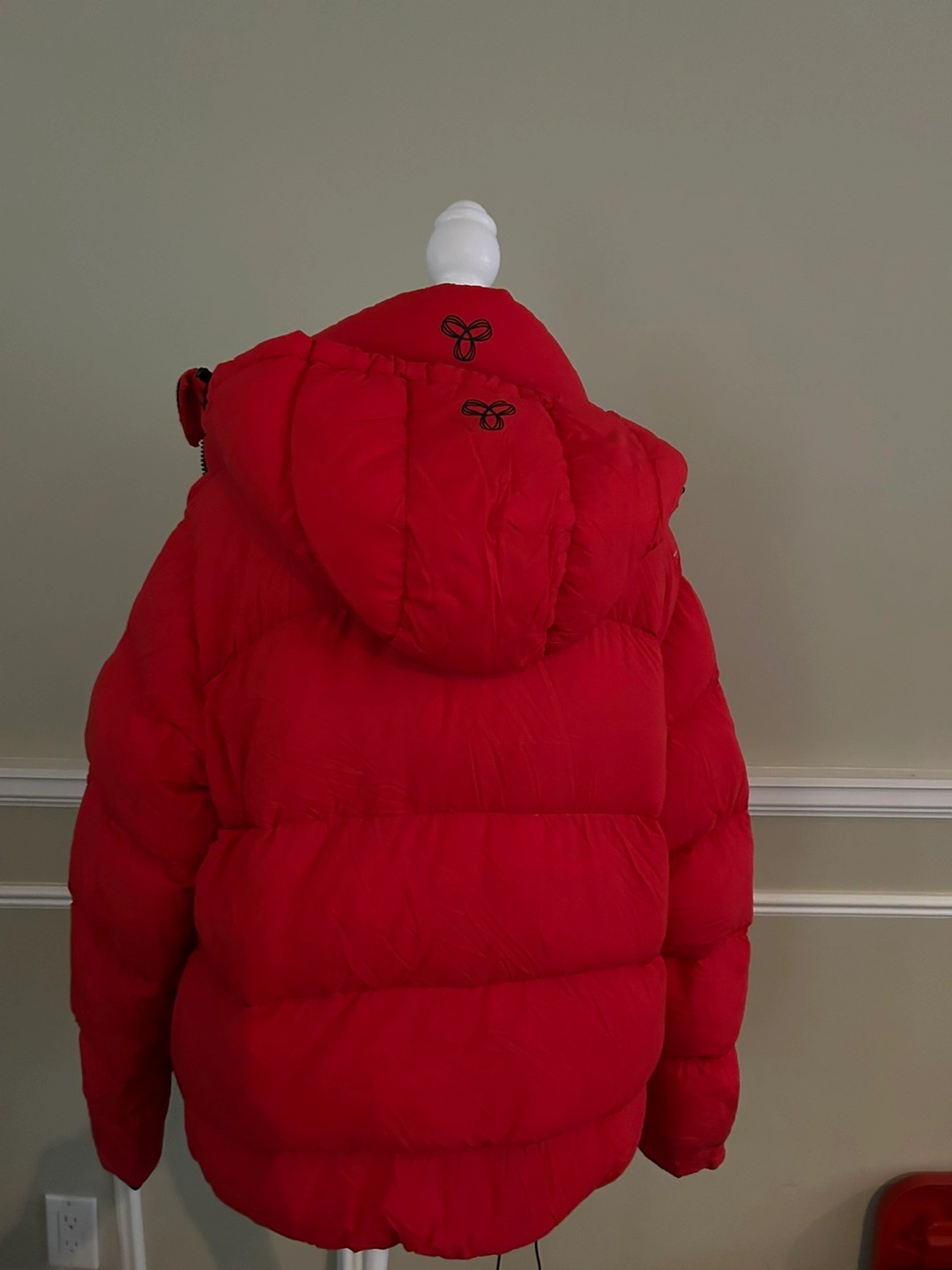 Red down-filled puffer jacket. Features a hood and zipper closure. Excellent for colder weather.