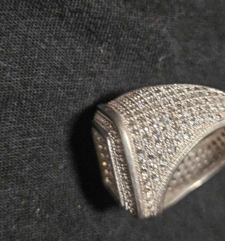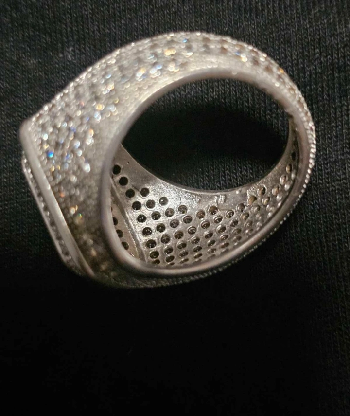 Silver men's ring. Features a large, square-cut centrepiece. Fully iced-out with small, clear moissanite stones. Band is also fully iced-out. Looks great, stylish and eye-catching.