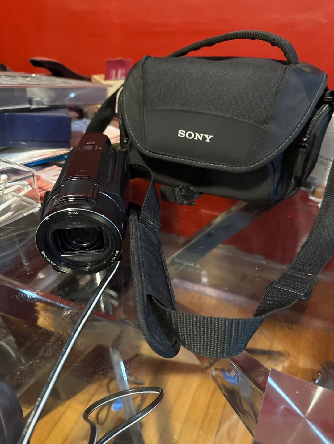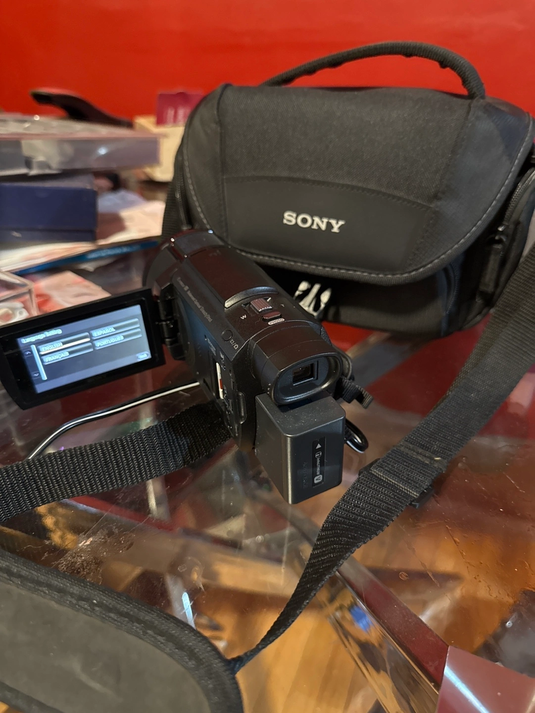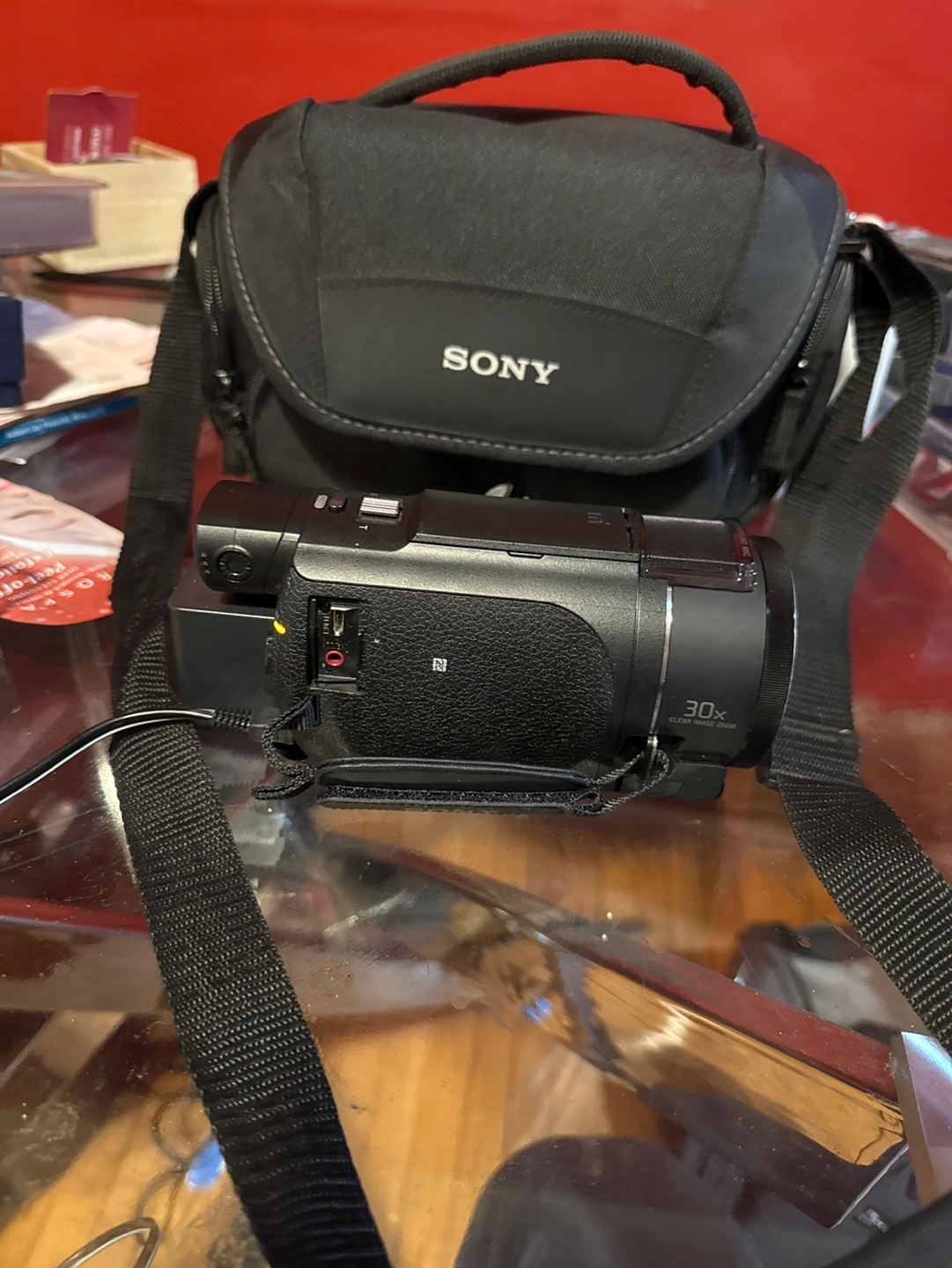 175Black Sony Handycam camcorder, model FDR-AX53. 16.6 mega pixels and 30x optical zoom. Includes battery, charger carrying case and strap. Good condition.