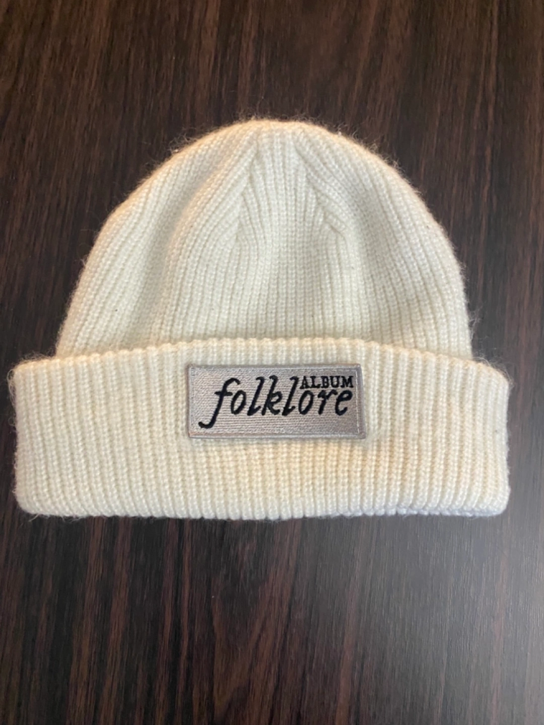 White-knit Taylor Swift Official Merch Folklore beanie. Soft material, good for colder weather.