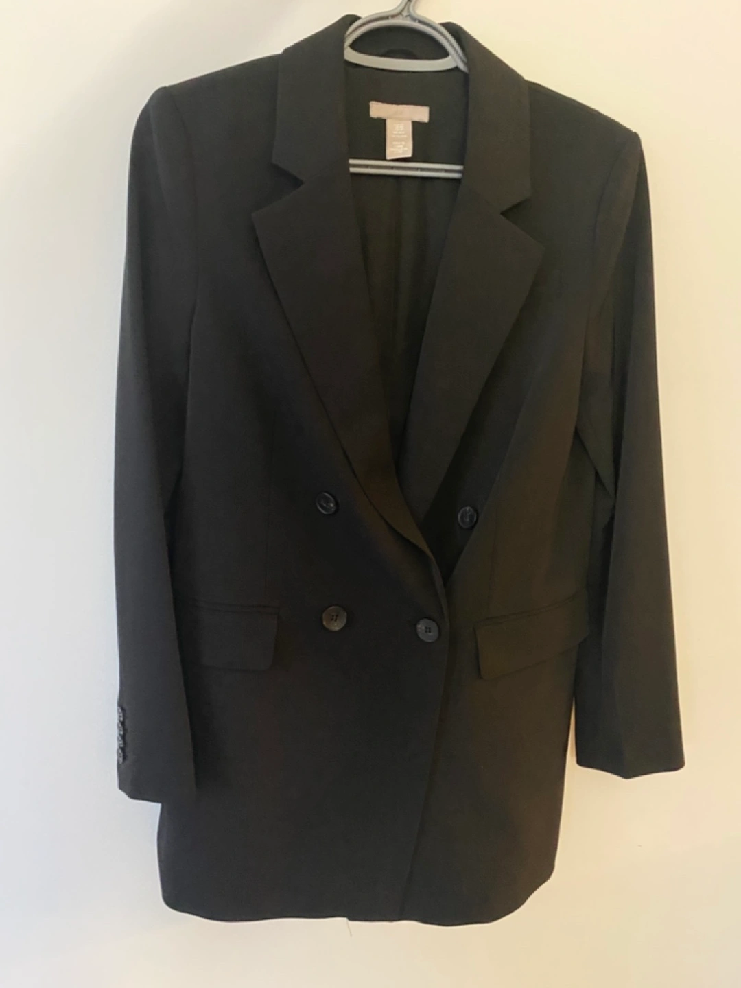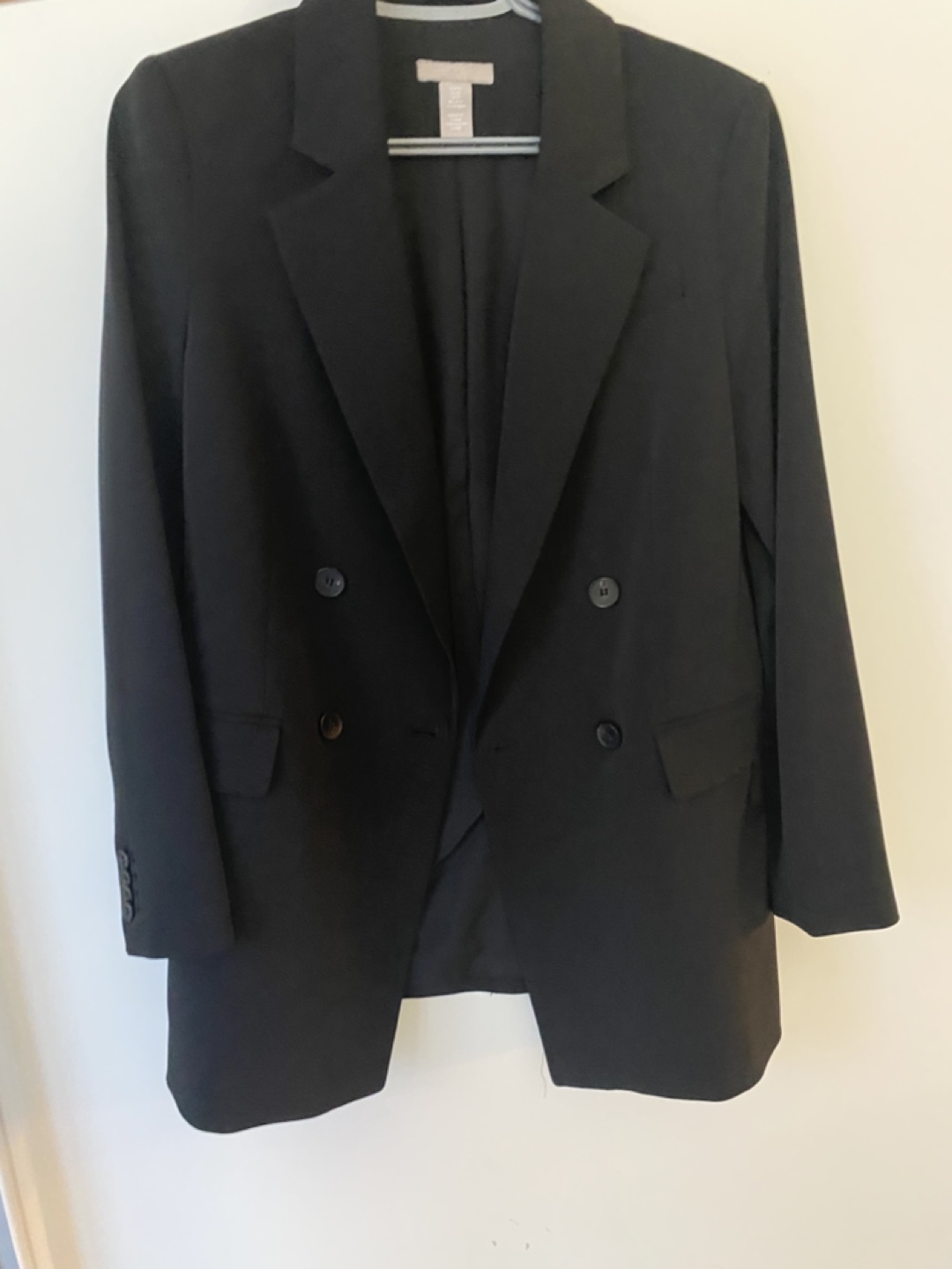 Women's black blazer. Double-breasted style. Long sleeves. Size XS. Good for work or special occasions.