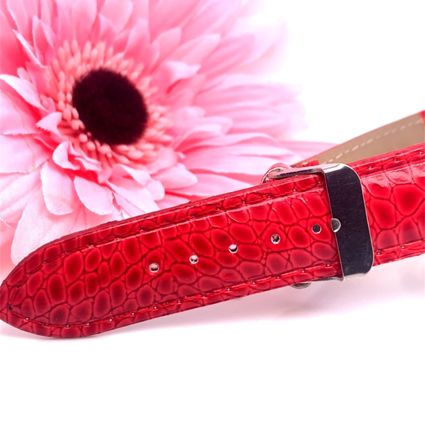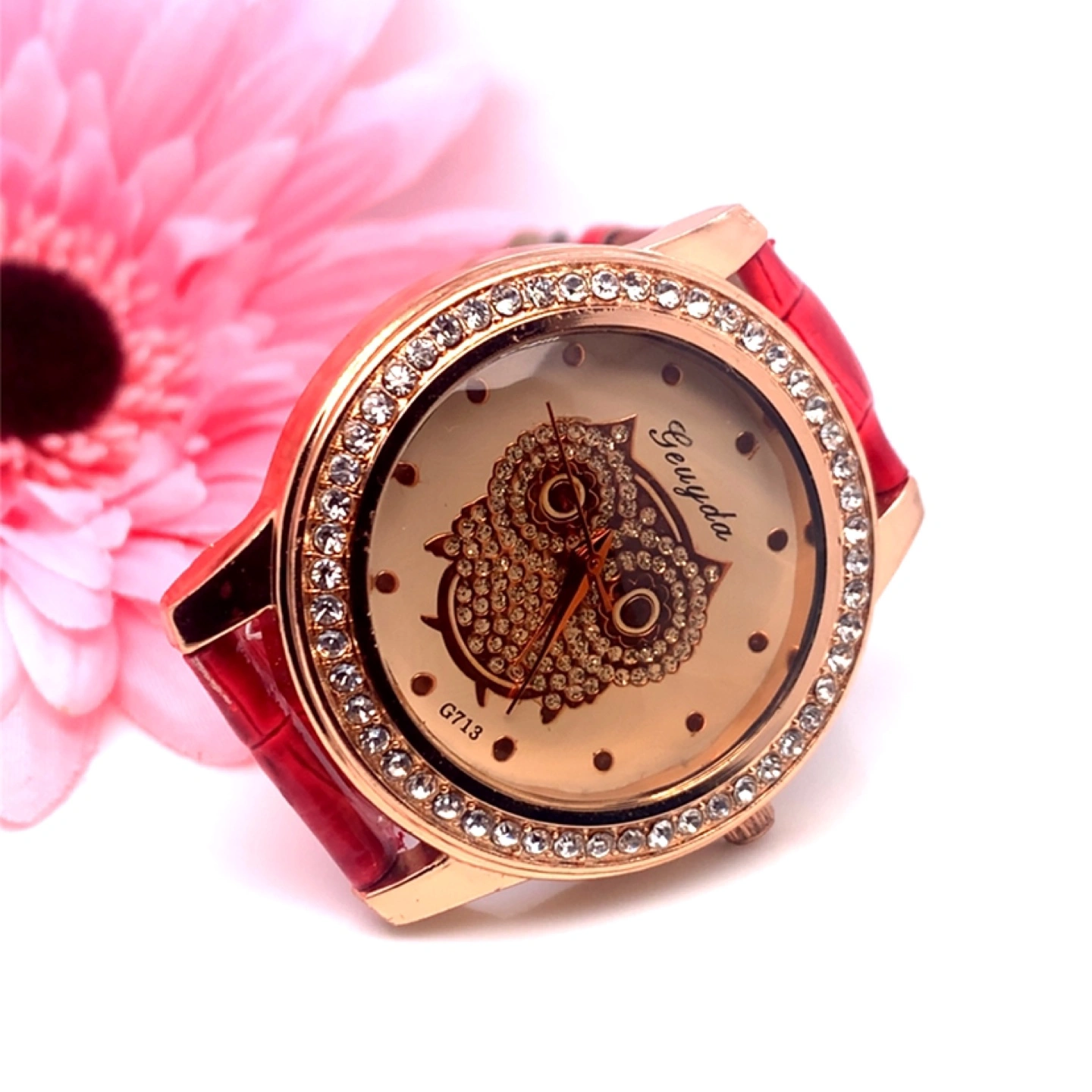 Women's wristwatch. Features an owl design, rhinestone accents, and a red leather band. Rose gold coloured case. Stainless steel back.
