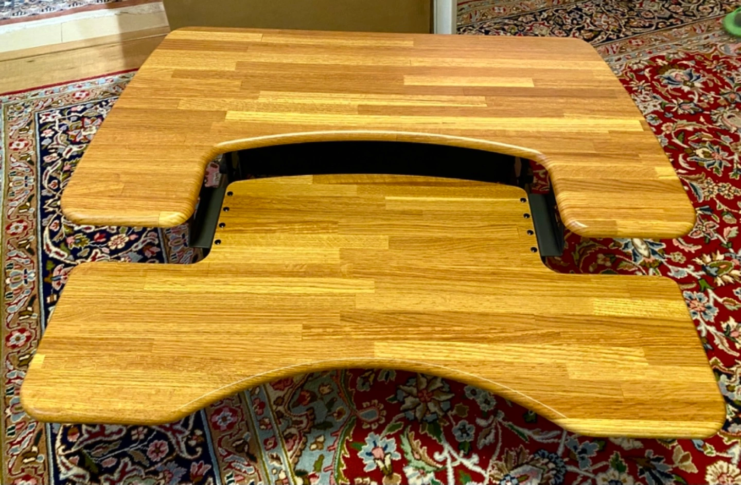 * Two-tier design with upper display surface and lower keyboard/mouse deck