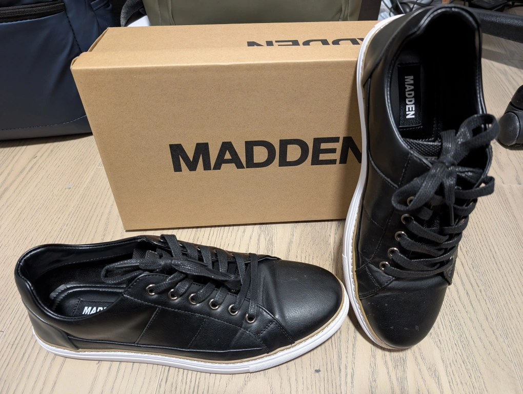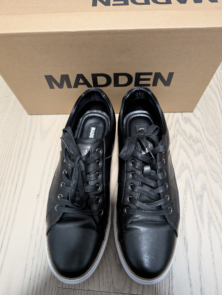 Black leather sneakers. Lace-up closure. Low profile. Comes with box.