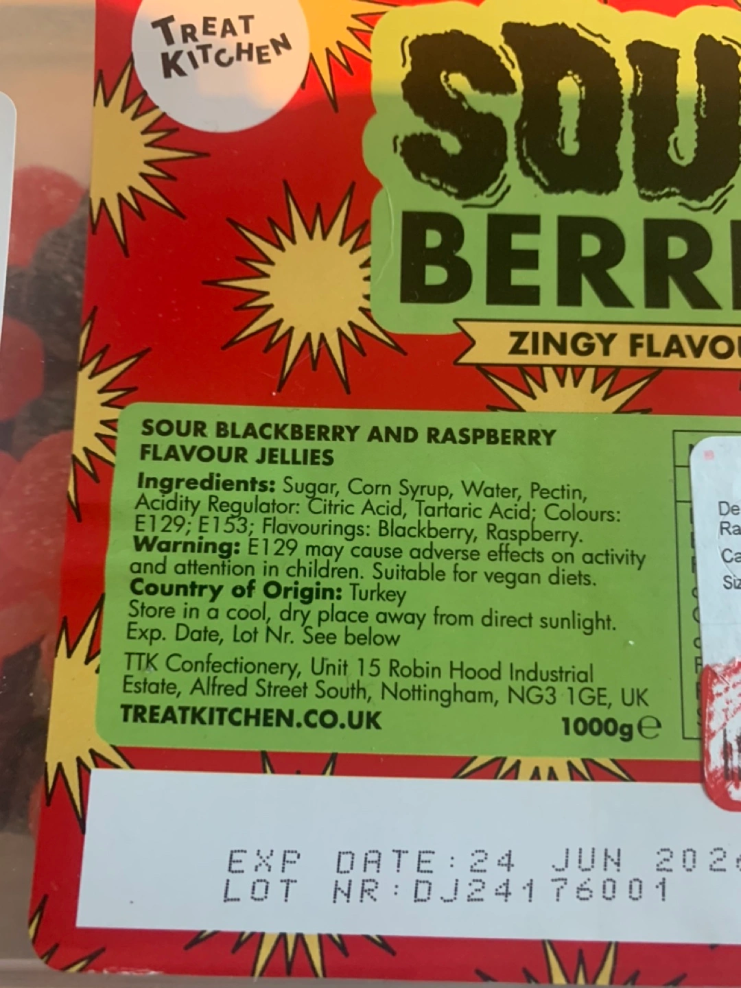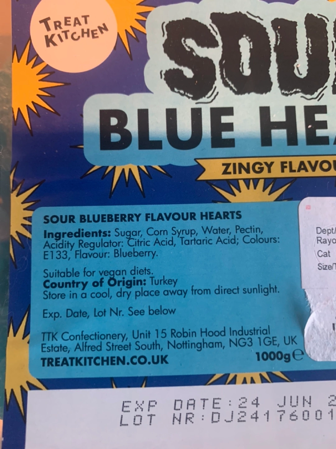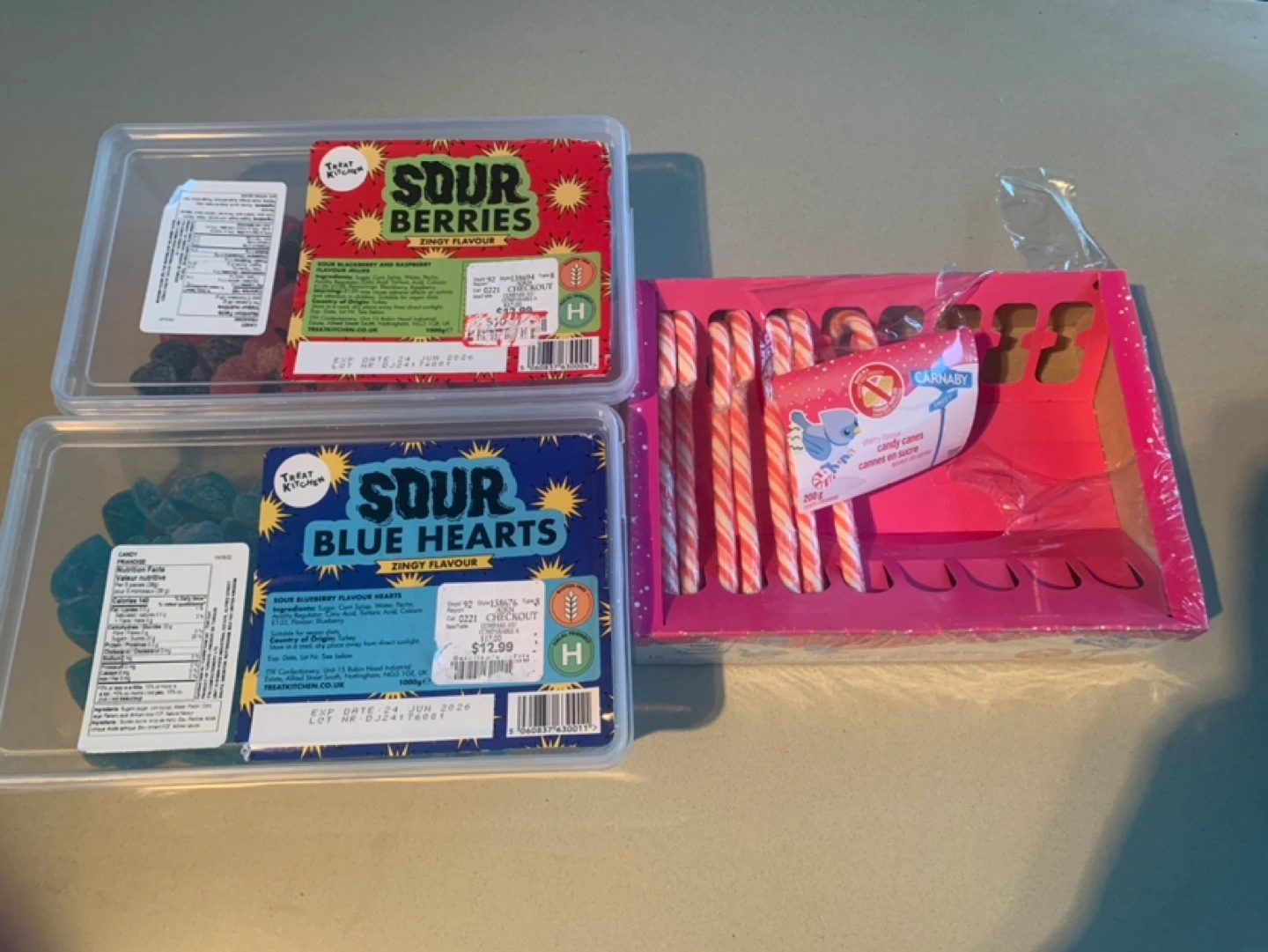 Bulk lot of candy. Includes two containers of Treat Kitchen sour jellies; one blackberry and raspberry, one blueberry. Both have been open but lots of candy left Also includes 7 Carnaby cherry candy canes.