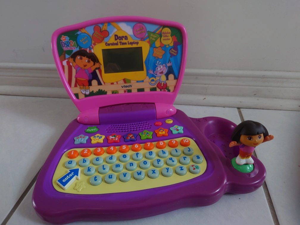 Pre-owned VTech Dora the Explorer Carnival Time Laptop. Features colourful design, interactive keyboard, and screen. Includes a small Dora figurine. Great for preschoolers.