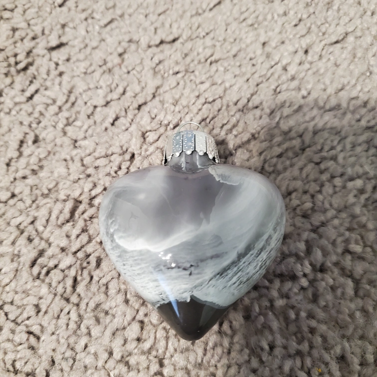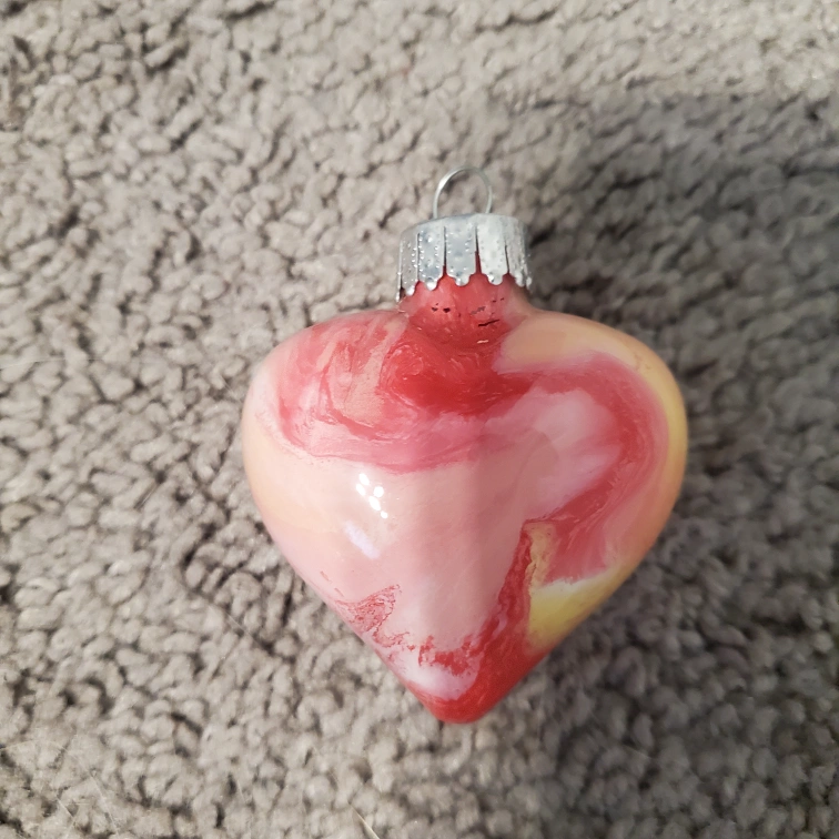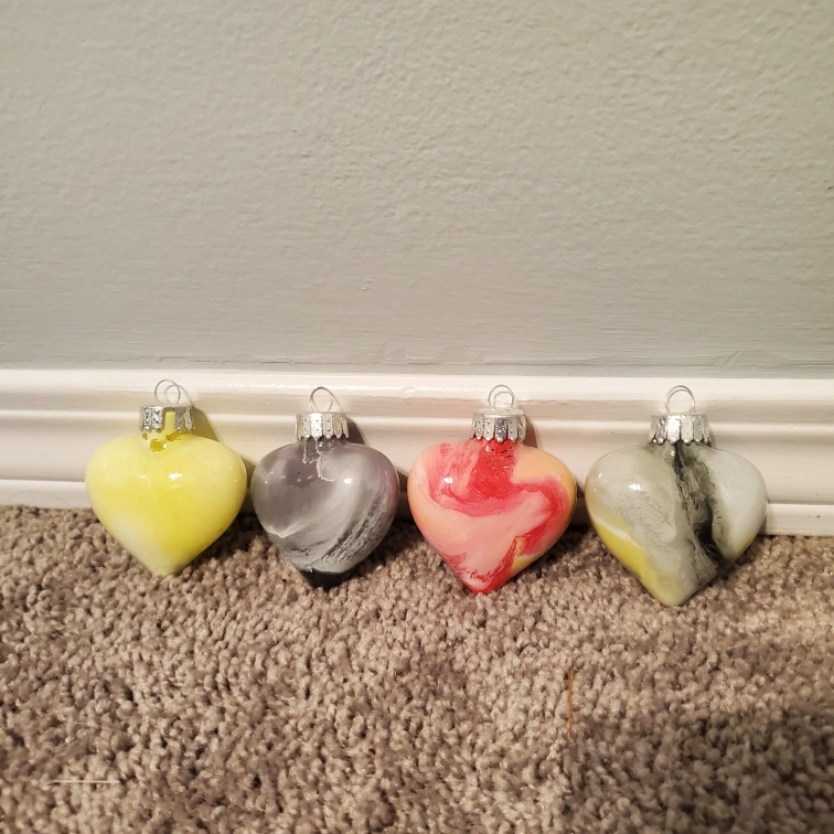 Four small glass heart ornaments. Unique marbled colours. Silver metal cap. Perfect for Christmas tree decorations or gift-giving or crafting. Located northside.