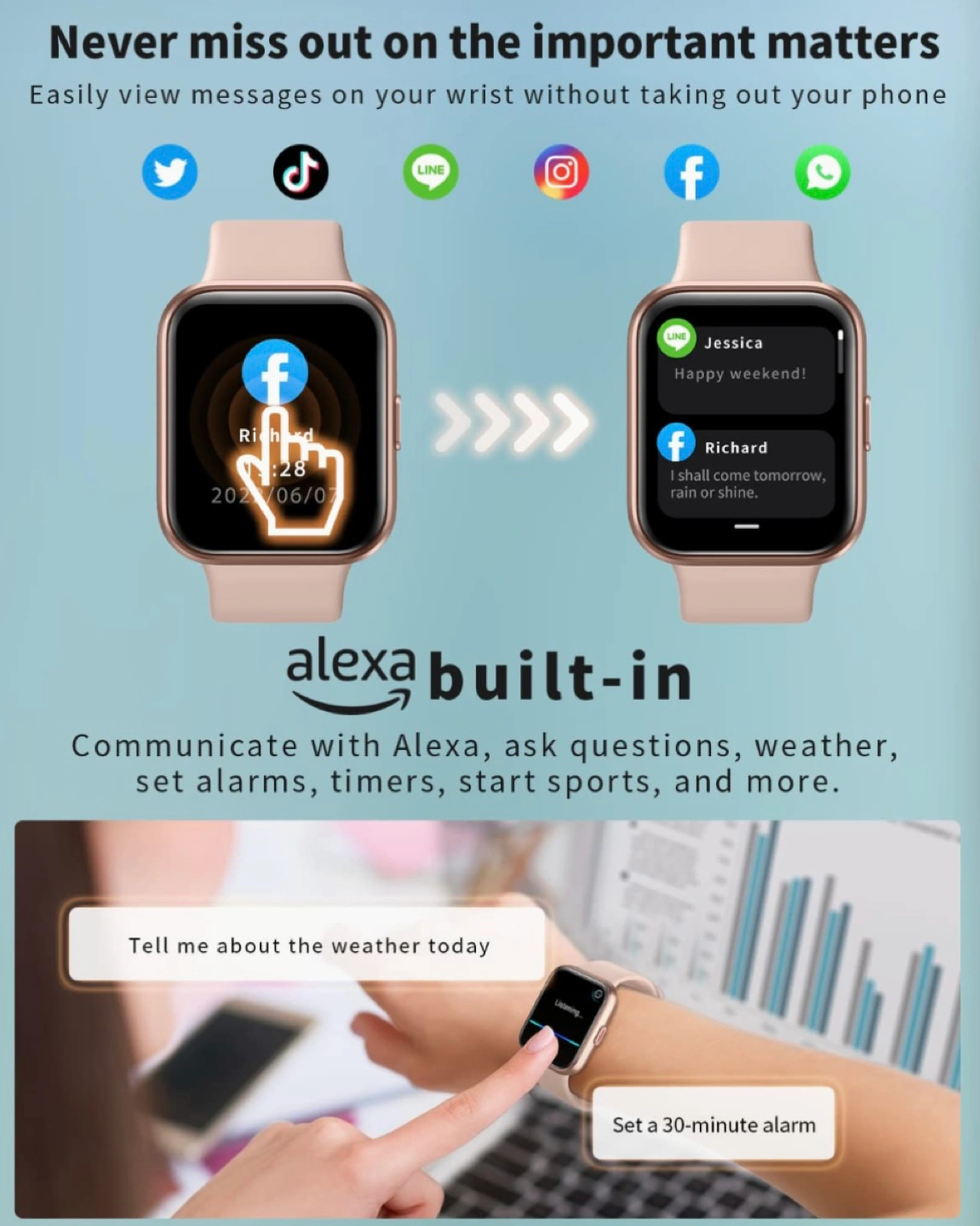 Alexa Built-in: Talk to Amazon Alexa, ask questions, check weather, and more by speaking to watch