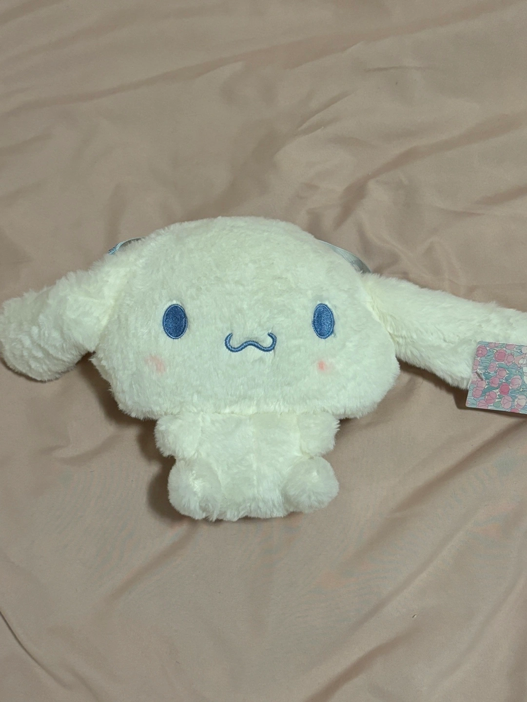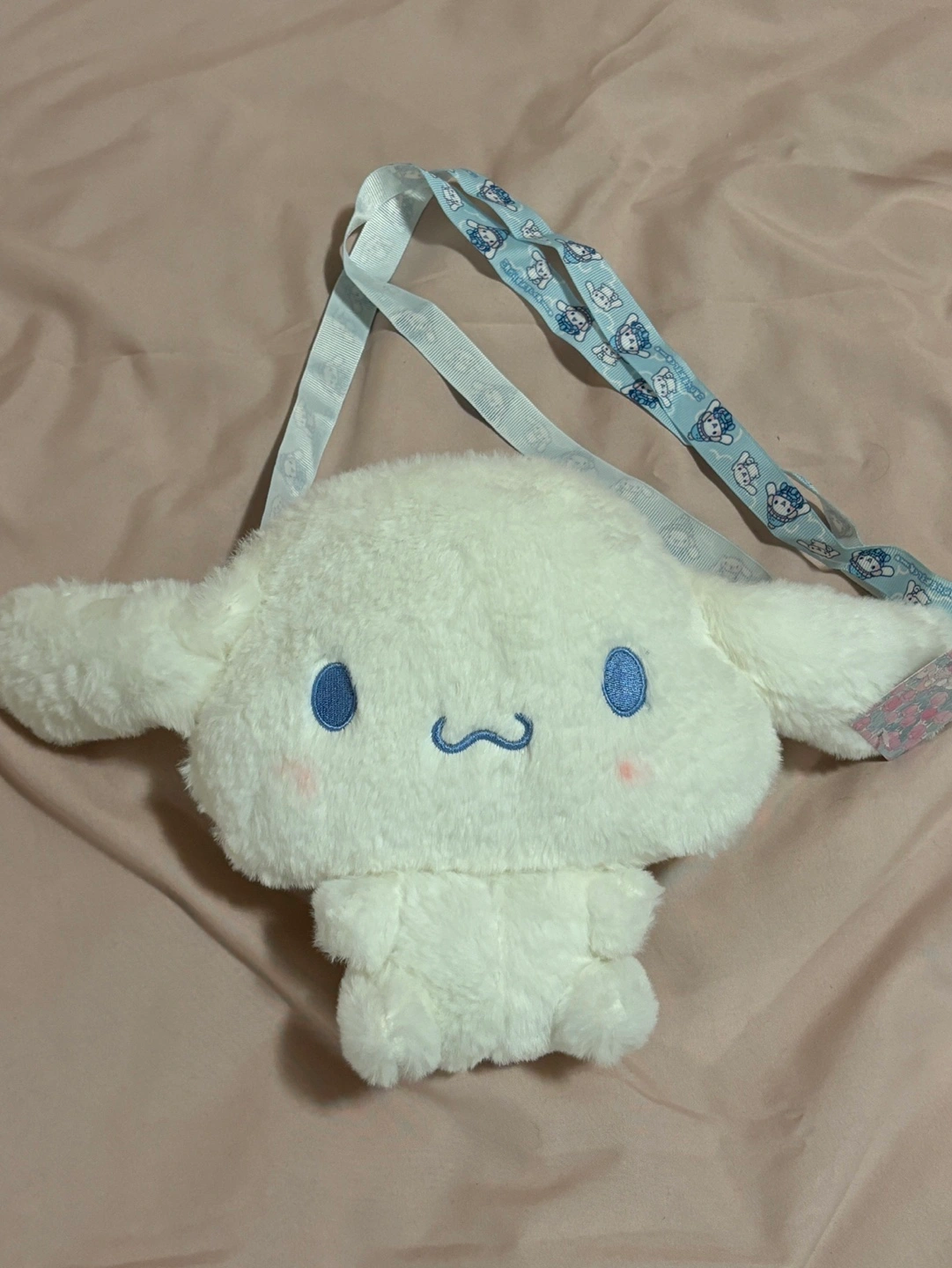 Sanrio Cinnamoroll plush shoulder bag. Soft, fluffy texture and a zipper closure. Has a strap featuring a repeating Cinnamoroll pattern. Perfect for carrying small essentials.