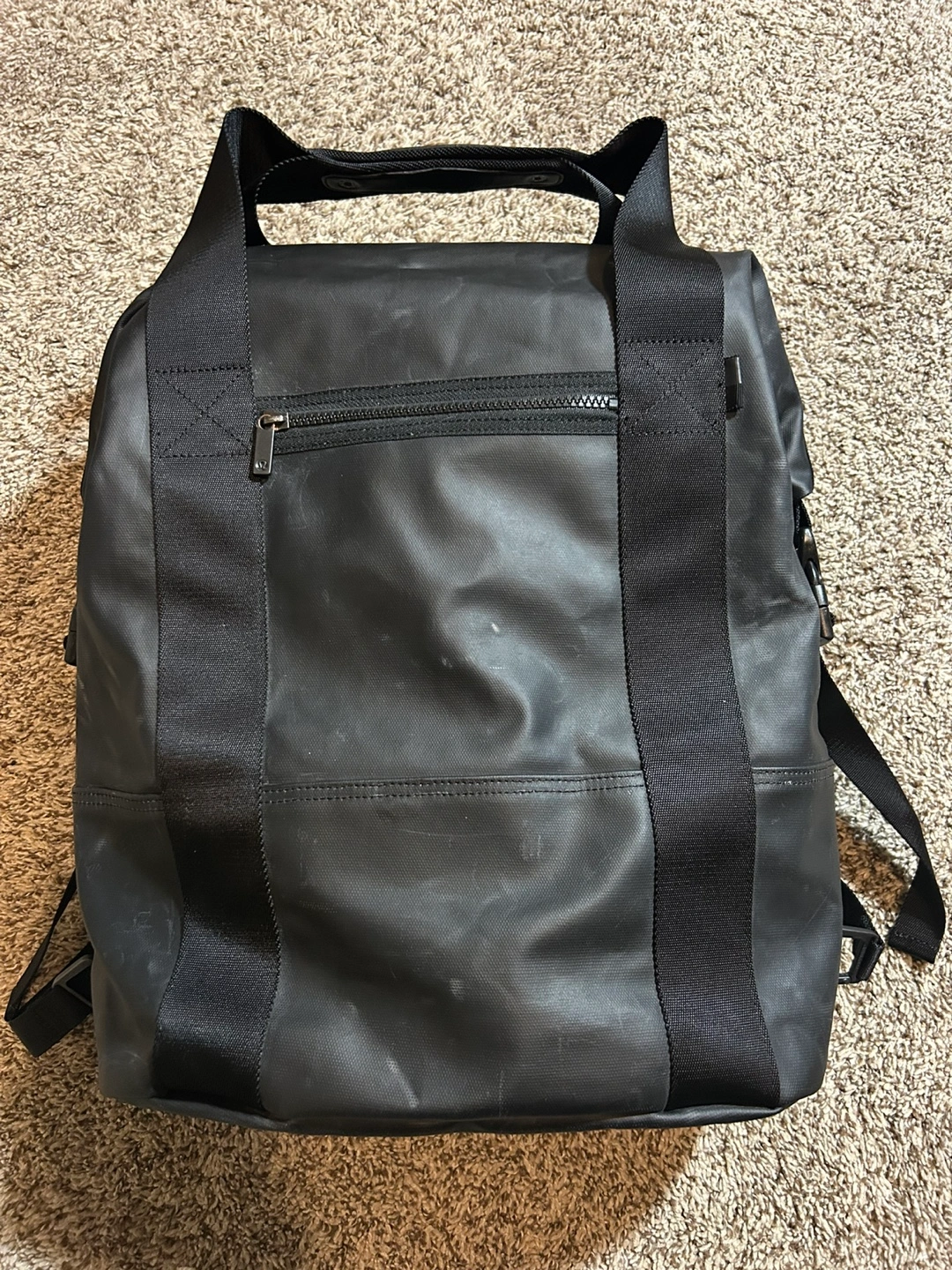 Black Lululemon City Adventurer backpack. Features a main zippered compartment, top handles, and adjustable backpack straps. Durable, water-resistant material. Perfect for everyday use or travel.