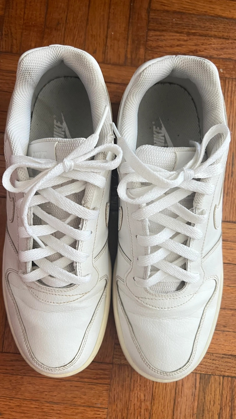 Pair of white leather Nike sneakers. Low-top design. Lace-up closure. Good for casual wear. Some minor wear but still really good.