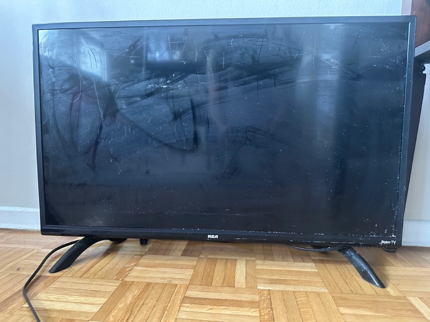 15Used RCA Smart TV. Screen shows some scratches and marks. Includes power cord. Sold as is. Display broken. Selling for parts