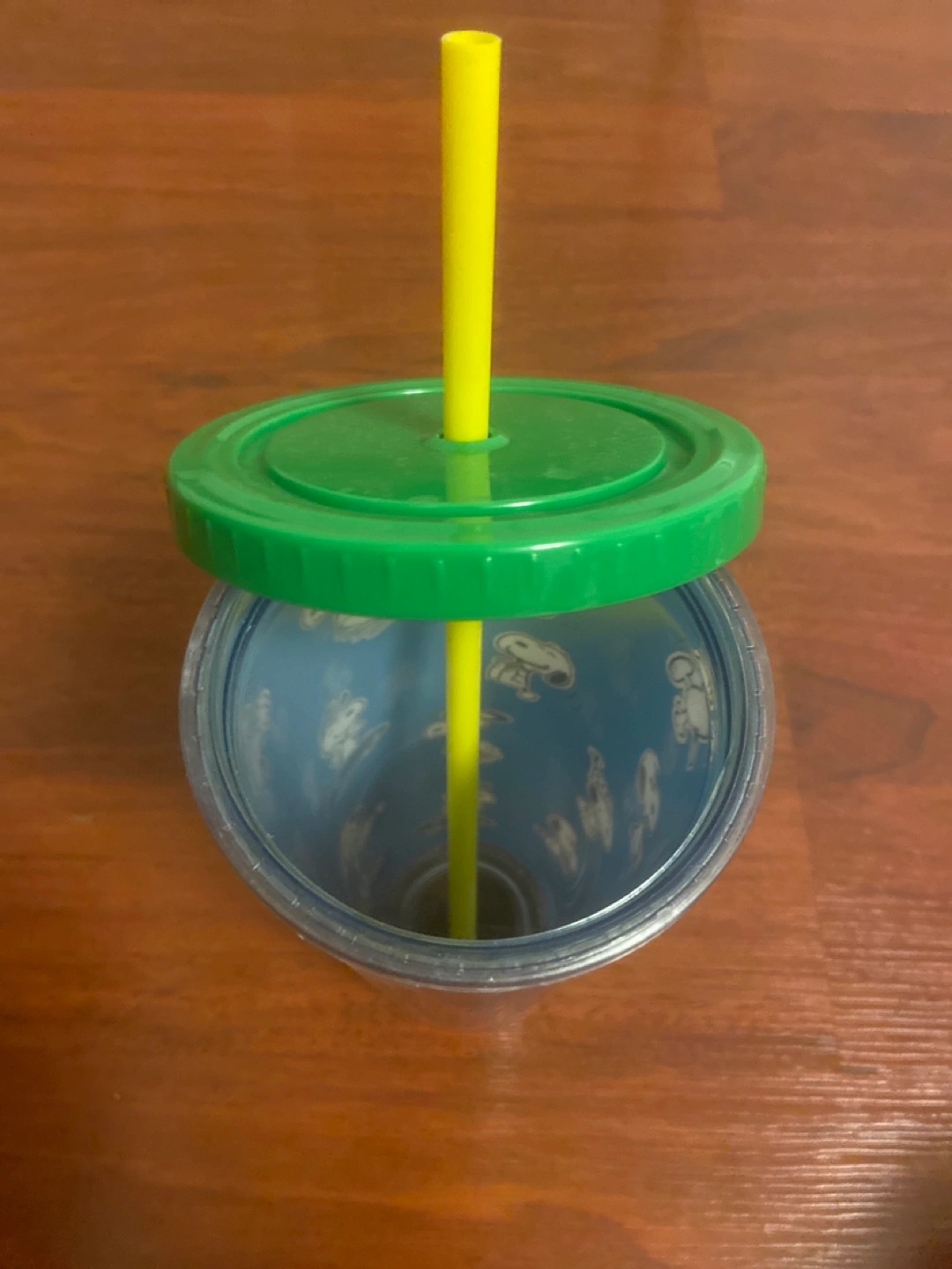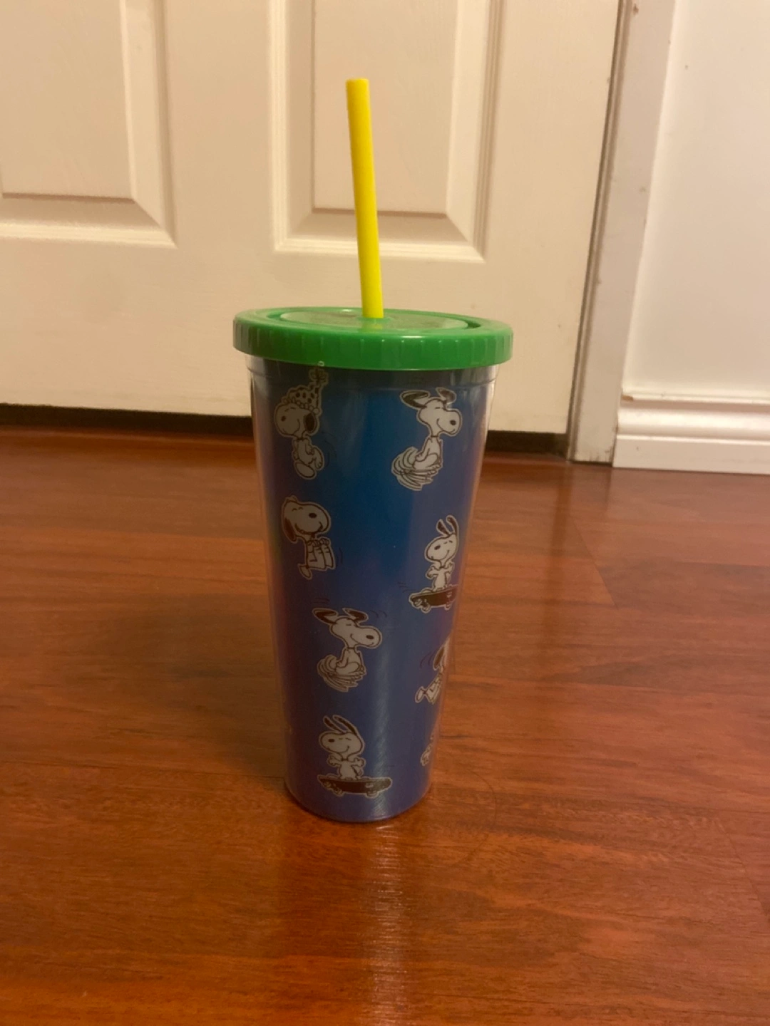Reusable plastic tumbler. Features Peanuts characters. Green lid and yellow straw included. BPA free. Hand wash only. Do not microwave.