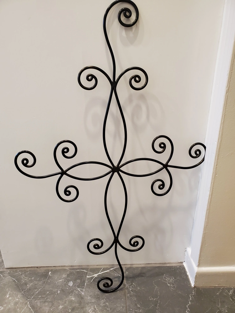 Three decorative metal wall hangings. Features scrolling designs. Dark bronze and black finishes. Varying sizes and shapes. Great for adding a touch of elegance to your home decor.
