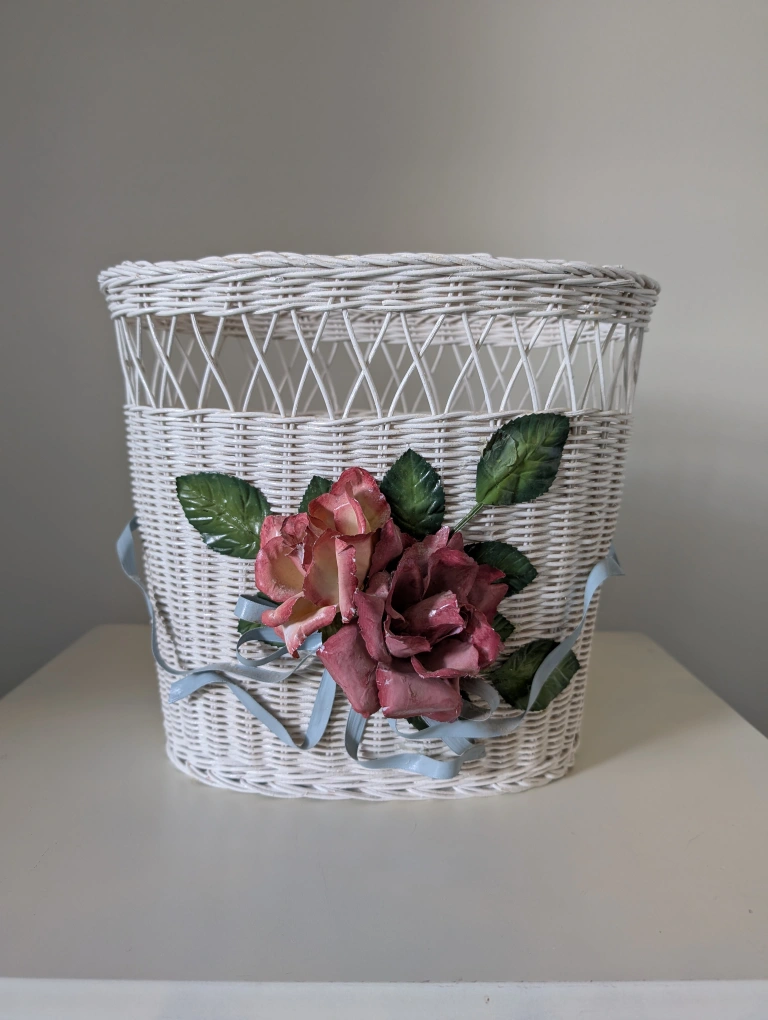 Vintage White Wicker Basket with Roses