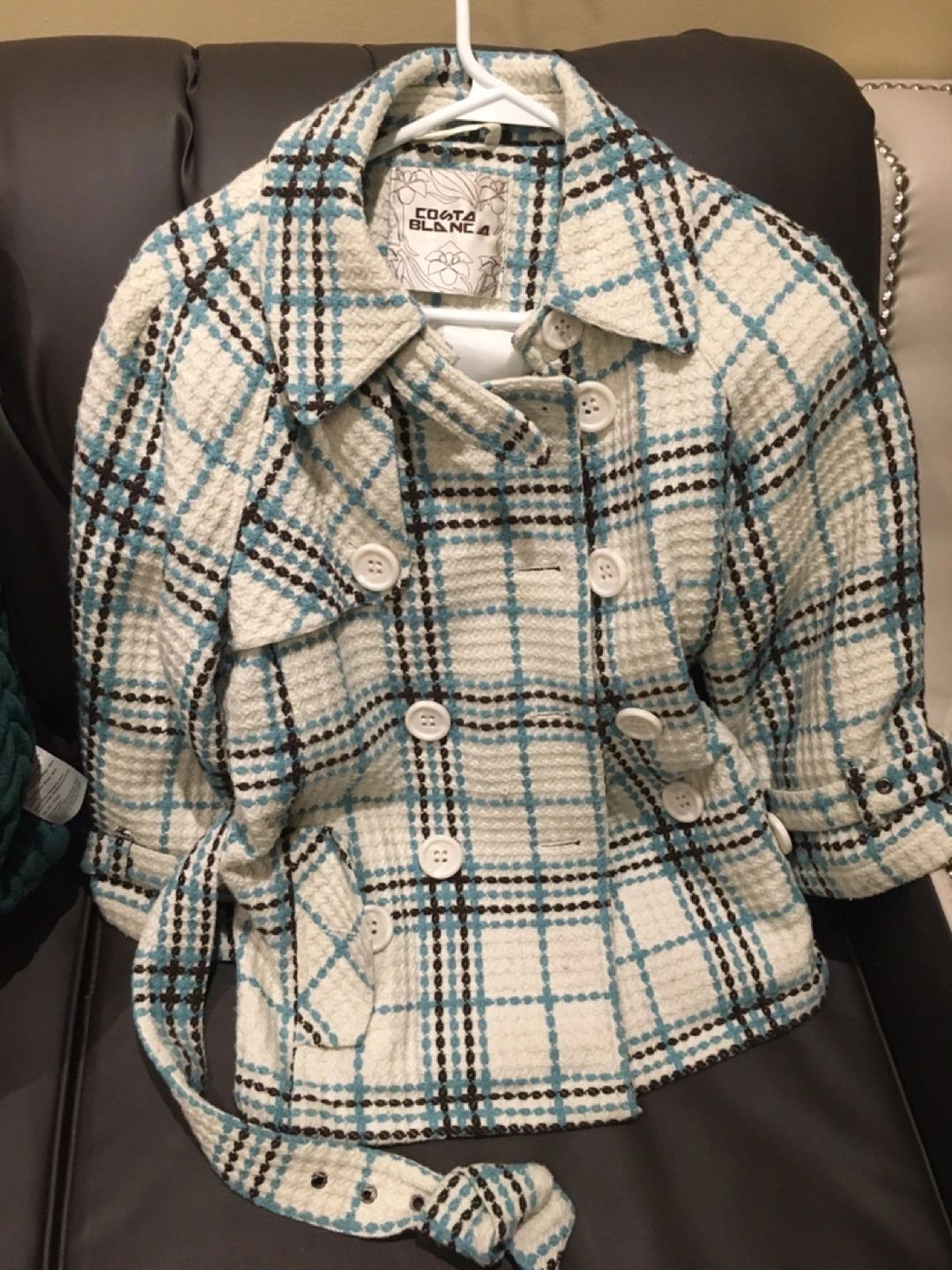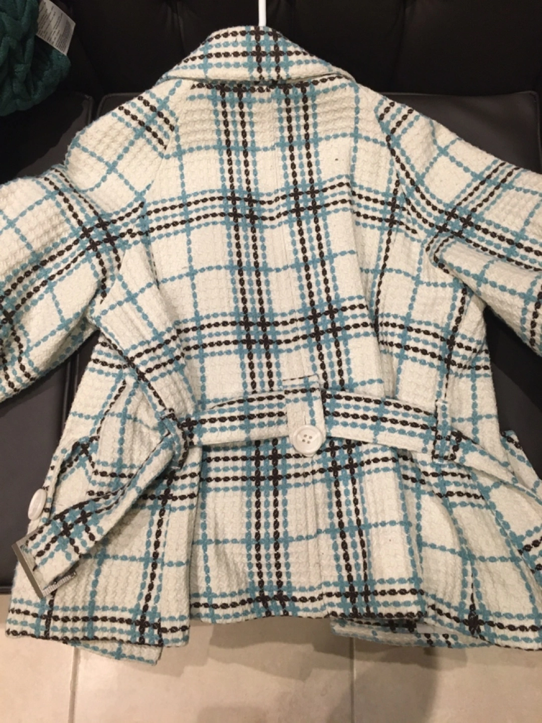 Women's jacket. Double breasted. Plaid pattern in cream, brown, and teal. Belted waist. Three-quarter sleeves.