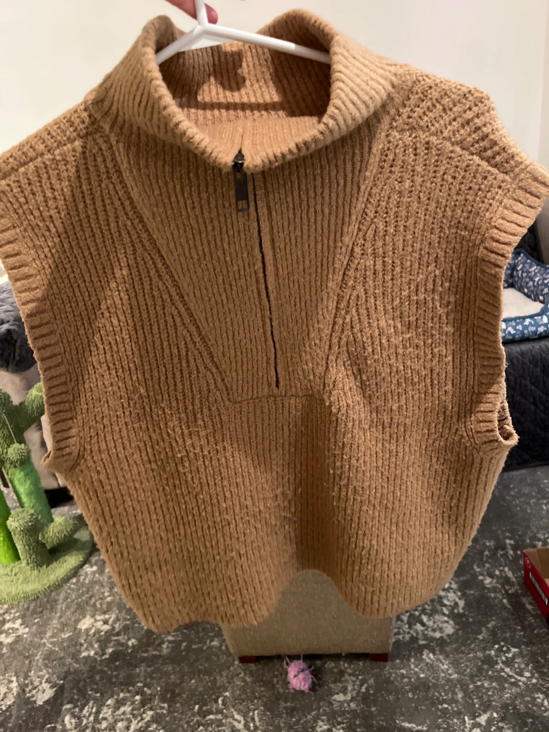 Women's sleeveless mock neck sweater vest. Light brown colour. Knitted fabric. Half zip closure.