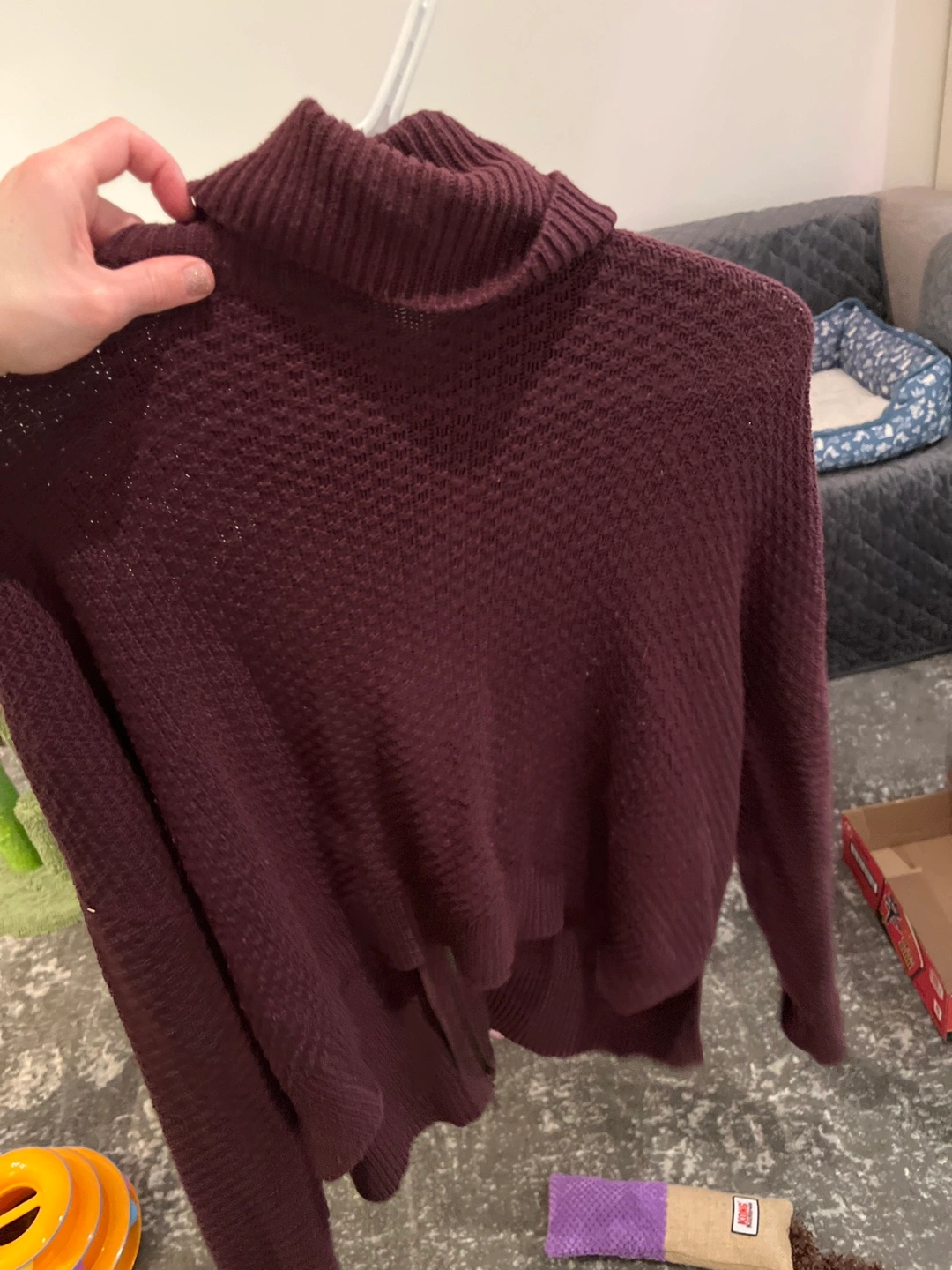 Cozy burgundy turtleneck sweater. Waffle knit texture. Long sleeves. Relaxed fit. Zip at back for extra flair