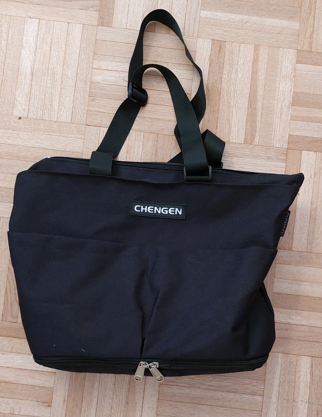 Black shopping tote bag on wheels. Features two top handles, a shoulder strap, and multiple zippered compartments. Great for grocery shopping or carrying heavy items.