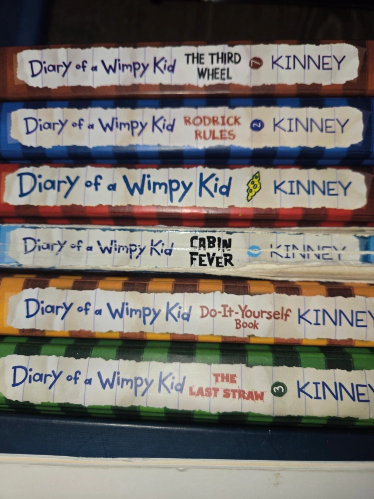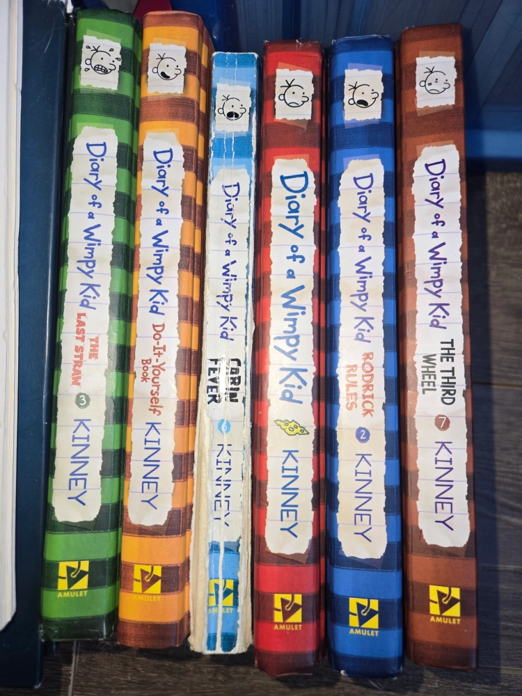 Set of Six Diary of a Wimpy Kid books. Titles include: The Third Wheel, Rodrick Rules, Dog Days, Cabin Fever, Do-It-Yourself Book, and The Last Straw. Amusement Park. https://www.amazon.ca/Diary-Wimpy-Kid-Book-ebook/dp/B005CRQ4OW?dplnkId=b9ea0025-eb5d-42aa-acab-bf7e0e044397