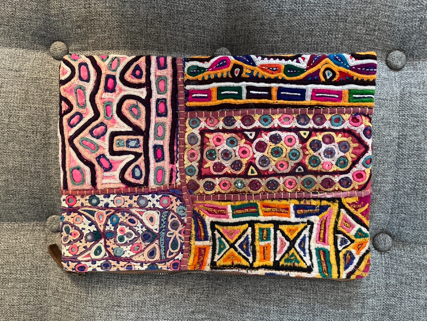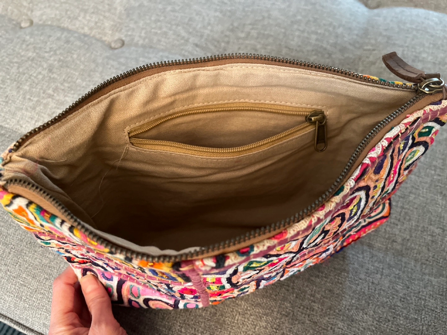 Unique colourful pouch. Handmade. Features intricate embroidery and patchwork design. Envelope-style with zip closure and interior pocket. Like new. Never used.