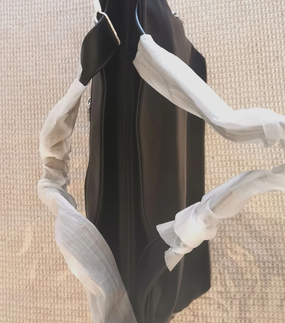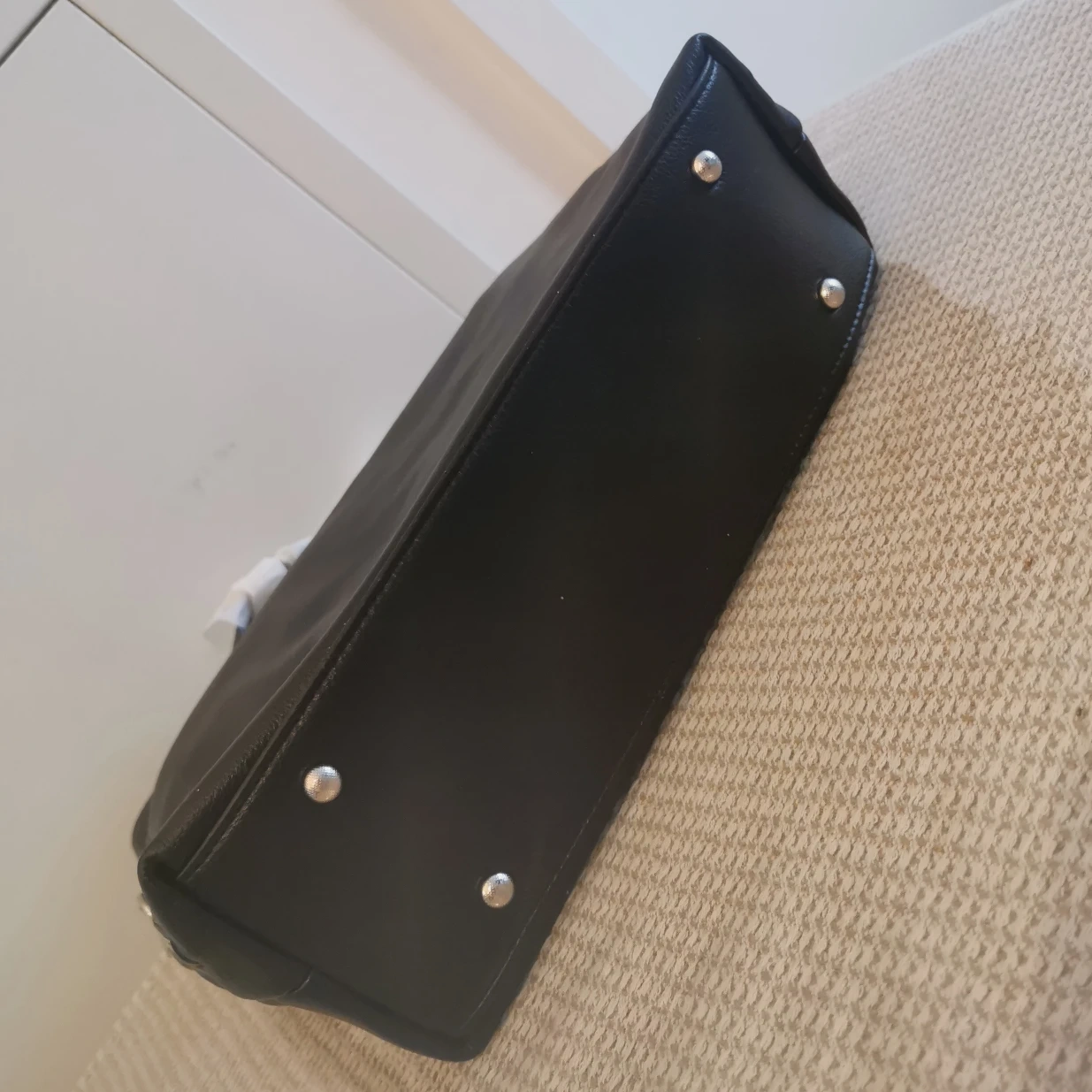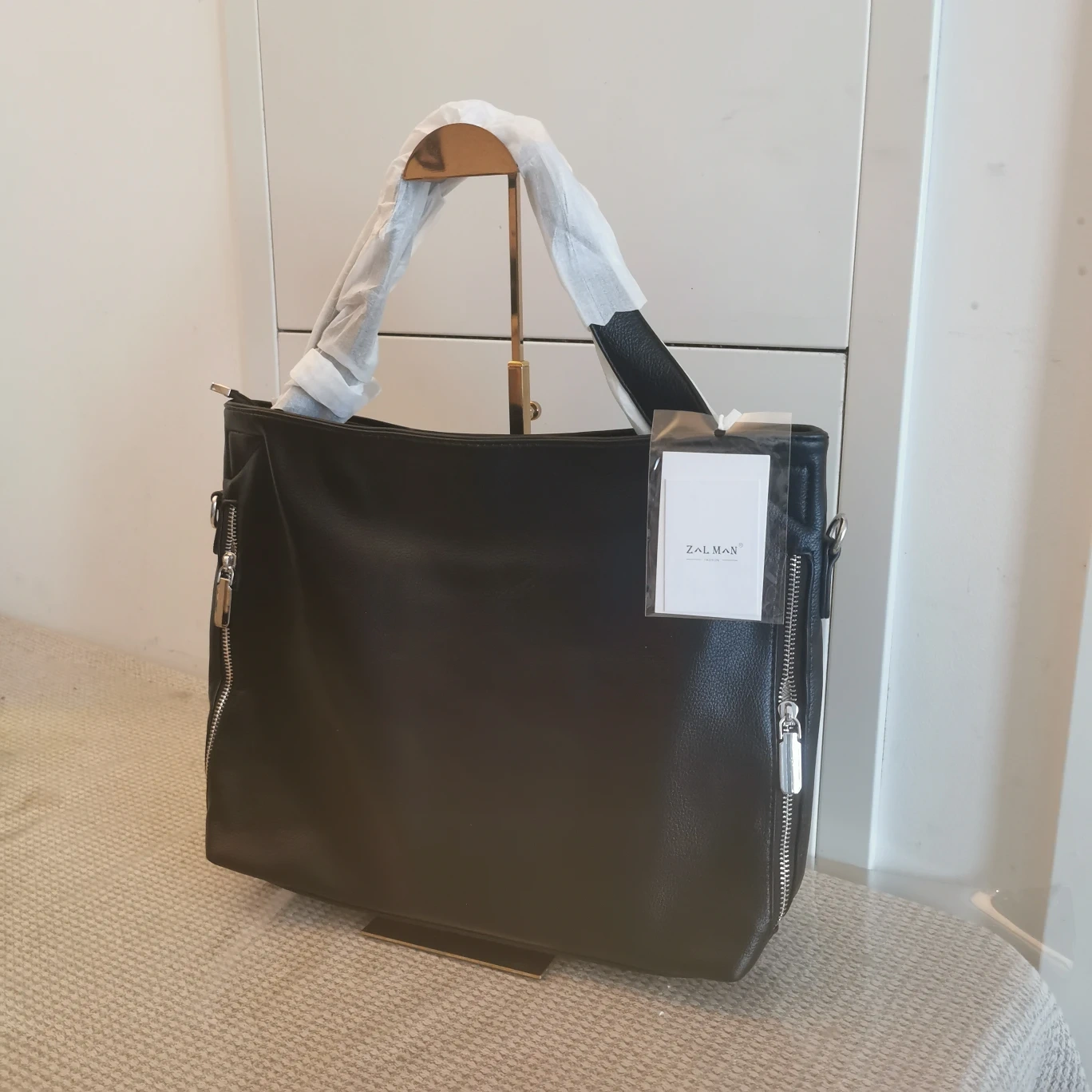 Stylish black tote bag. Features a top handle and a detachable shoulder strap. Multiple zippered compartments. Perfect for everyday use.