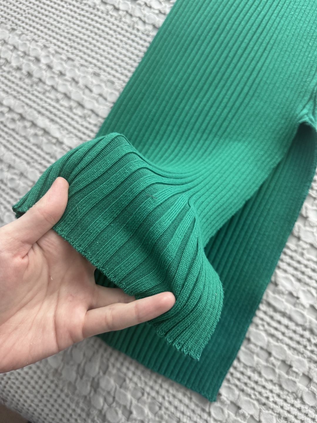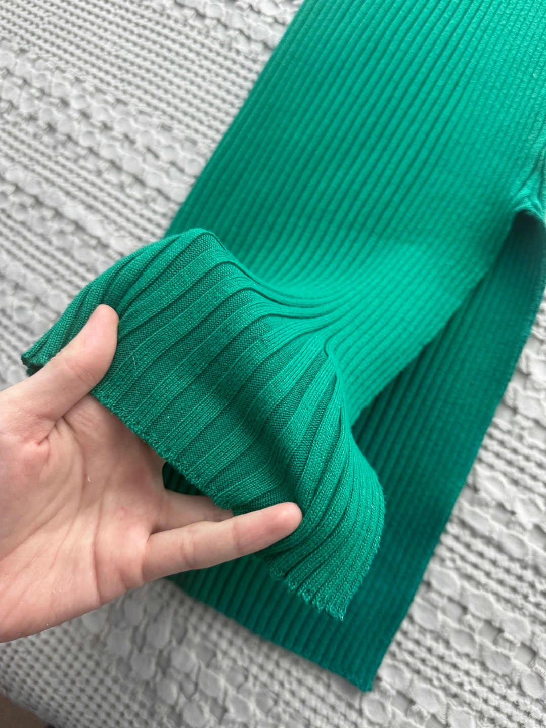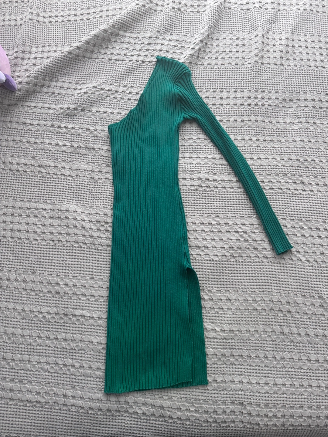emerald green mini dress. One-shoulder design. Long sleeve on one side. Ribbed knit fabric. Side slit. very stretchy and comfy