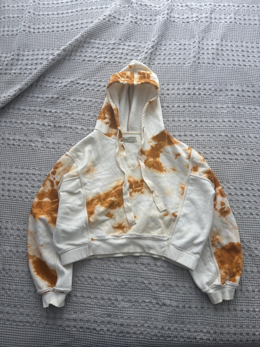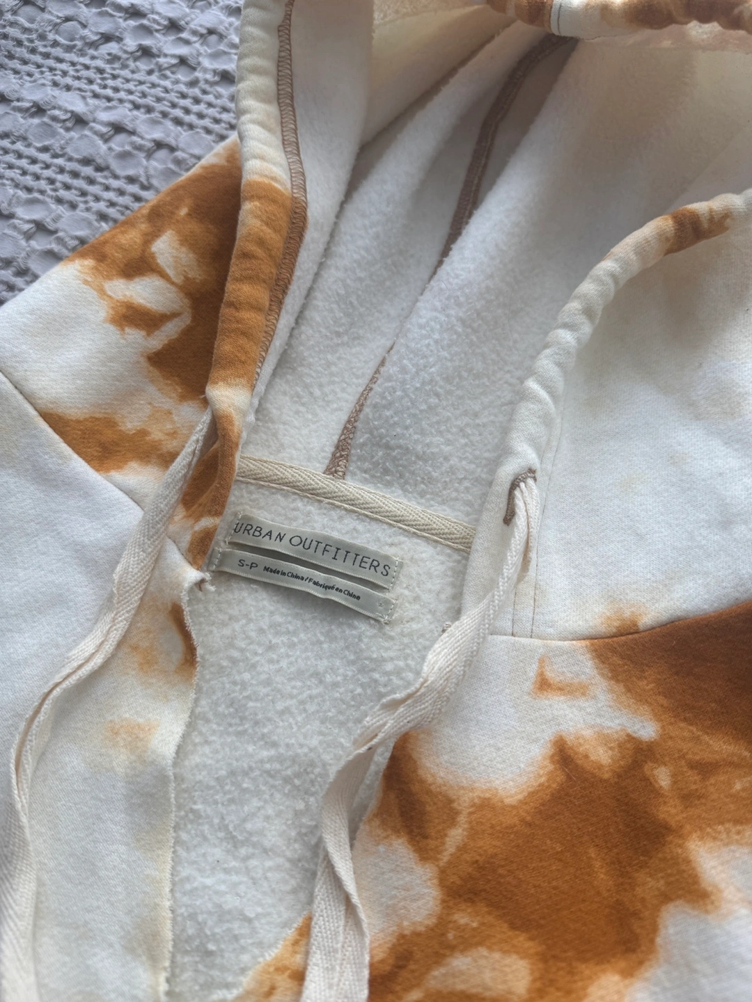 Cream and brown tie-dye cropped hoodie. Features a drawstring hood and raw edges. Small size.