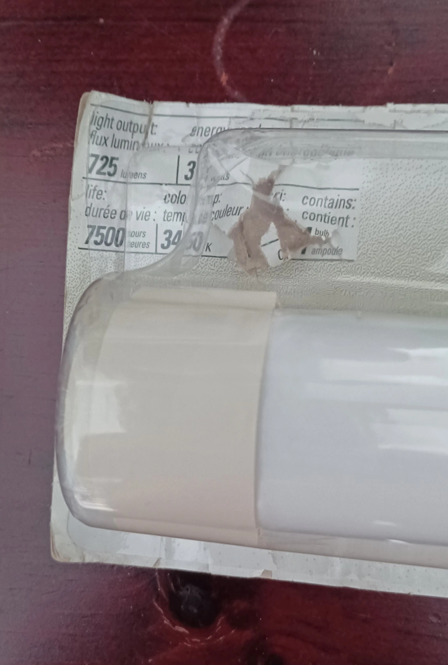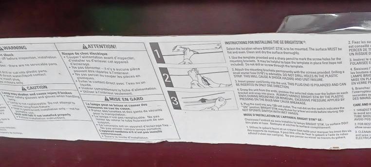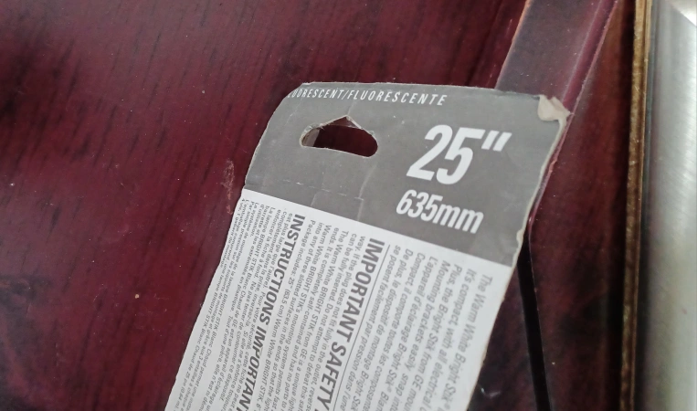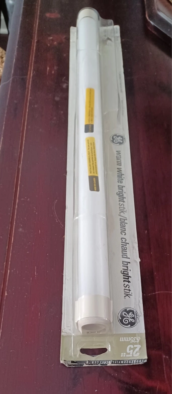 New, opened (open) 25-inch GE BrightStik fluorescent light bulb. Warm white colour temperature. Includes installation instructions.